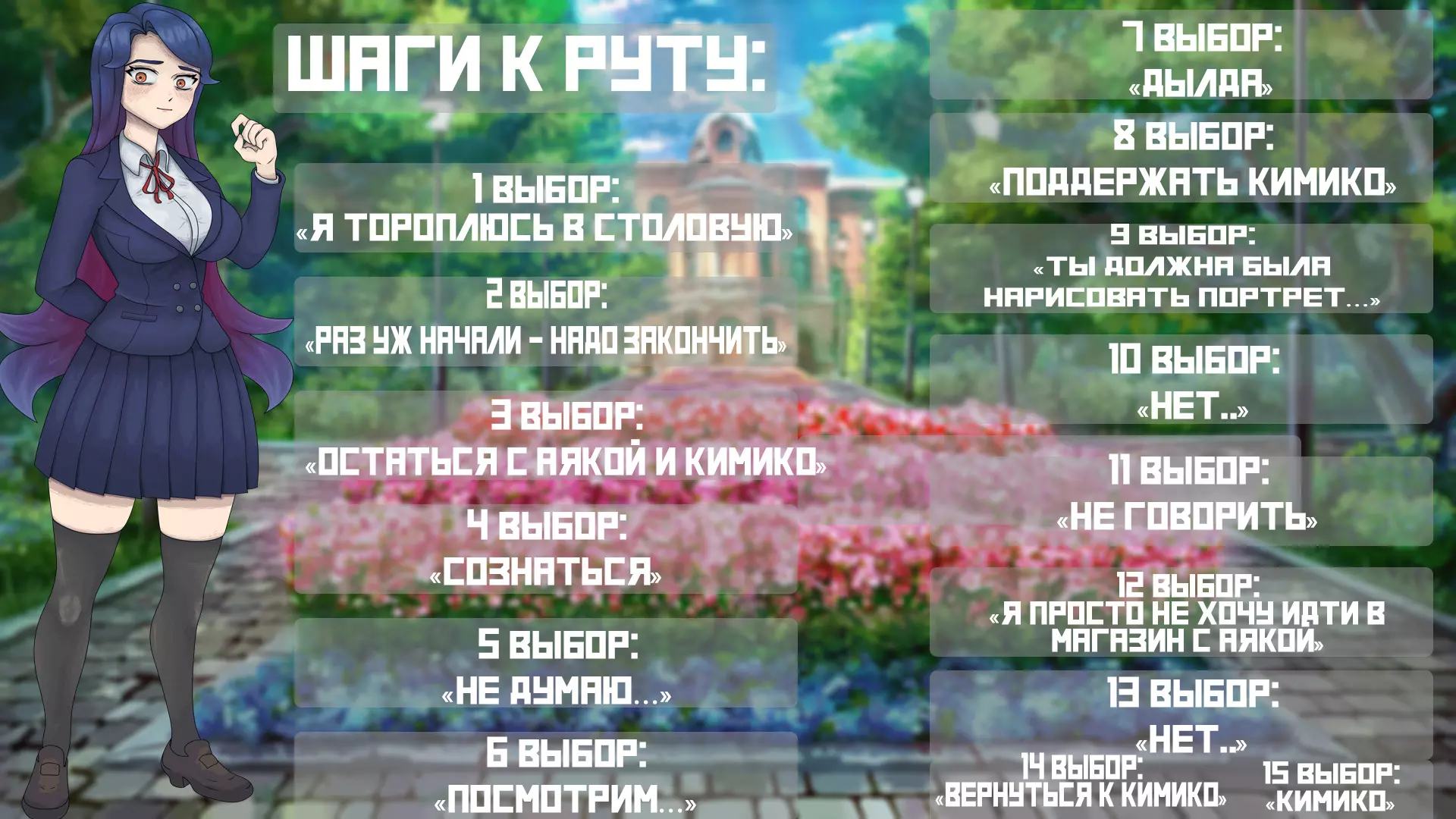 纪子 -我赶去食堂 -既然开始了就要完成 -和彩香、纪子待在一起 -坦白 -傻瓜 -支持纪子 -不 -我只是不想和彩香去商店 -回到纪子身边 -纪子 彩香
