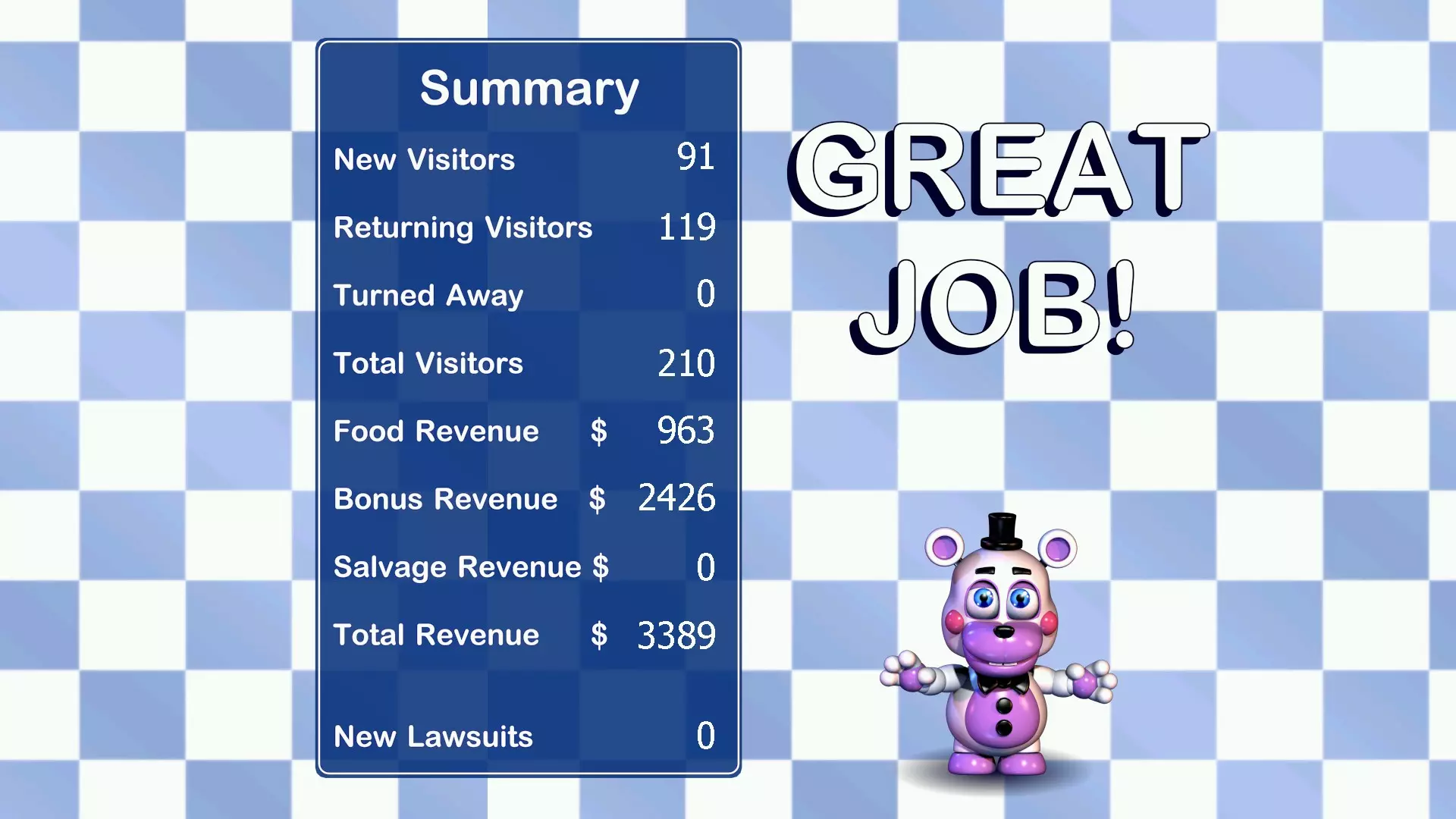 如何在零诉讼且无人前来袭击你的情况下通关游戏,同时保持较高的 Faz 评分。 简介 你是否想在订购杯子时不必冒着生命危险?是否想让孩子们尽情玩乐的同时自己不用面临任何诉讼?好吧,你来错地方了。如果想那样的话,还是去找份工作吧。不过本指南会告诉你如何轻松通关这款游戏。 如何度过每一天以疏通厕所 技巧一 把所有东西都扔回小巷。 回收收益并不值得。即便是价值 5000 美元的【Lefty】也一样。 那些钱可以通过其他方式轻松赚到。 技巧二 不要购买【Lefty】。 就算他只要 5 美元也别买,他会来杀你(而且有 9 的 liability risk)。 技巧三 不要购买任何降价商品, 因为可能会有东西来杀你。(左侧查看降价商品时的信息警告中提到。) 最后的提示 不要购买存在责任风险的电子玩偶,因为它们可能会来杀你。 这部分将说明如何避免任何诉讼 提示一 不要购买责任风险等级为2或更高的任何物品。 责任风险等级为1的物品可能有安全绳选项。 提示二 安全绳。 责任风险等级为1的物品可能有安全绳选项,因此购买时,请确保你有额外的50美元。 一个责任风险等级为1(安装安全绳后为0)的优质物品示例是火箭小游戏。如何持续赚钱 技巧一 购买具有大量额外收入加成的物品 例如:奖品之王 技巧二 购买具有高娱乐价值的物品。 这能吸引顾客再次光临,从而为你带来更多收入。 技巧三 不要回收电子玩偶。 回收带来的收入并不值得(如之前所讨论的)。 最后一条技巧 如何避免向左或向右查看 如果你遵循了之前的技巧,那么应该不会有东西来袭击你。广告也无关紧要,因为没有东西会听到它们。无论如何,还是要保持移动侦测开启,以防你购买了打折商品或其他可能意外来杀死你的东西。请注意,遵循本指南将无法获得任何秘密,所以如果你追求秘密,就不要遵循本指南。但如果你这样做,就可以不受干扰地更换灯泡。 以下是正确操作时的一些预期示例: 我的第四天最终数据: