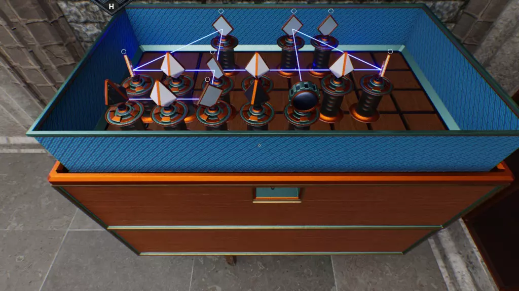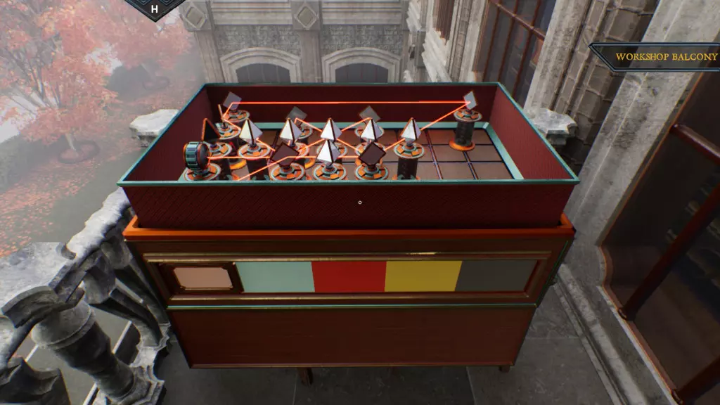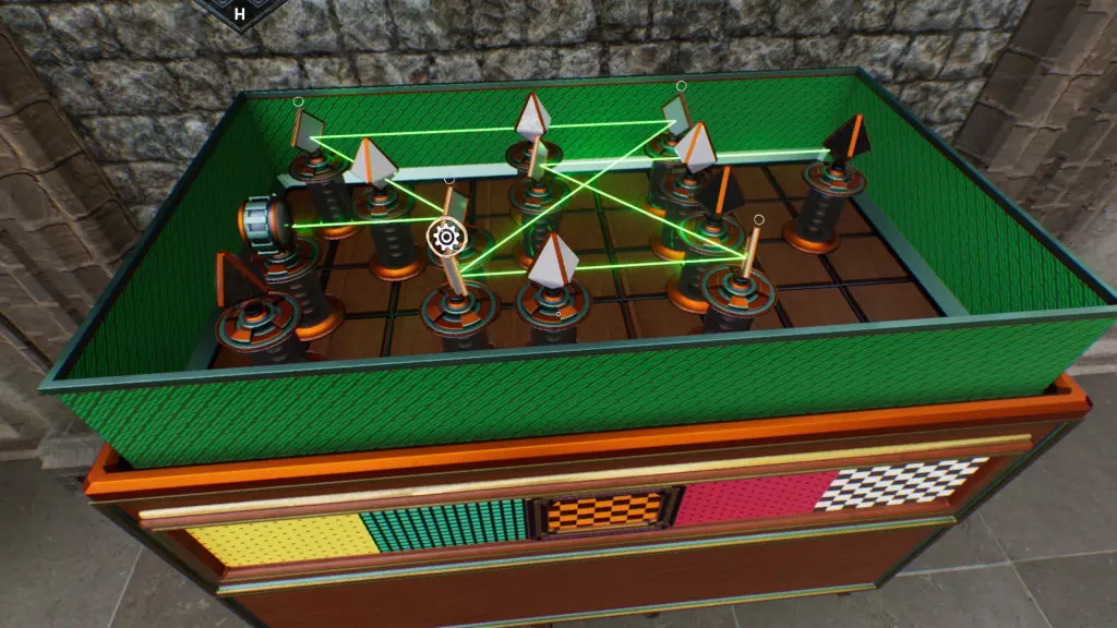 进行一场别出心裁的槌球游戏。 要达成此成就,你首先需收集散落在槌球场上的所有槌球头(3个)和槌球门(4个)。它们很难被发现,要充分使用【高亮物品】按钮。接着,你必须按照手术台上显示的门的颜色,在三个序列中各击打对应颜色的门三次。注意,一个门仅计数一次,对于最长的序列,你需要经过一个门两次,但它也只算一次。你必须从最短的序列开始,逐步积累,因为一开始你没有足够的门。 如果球停在推杆前,推杆会自动击球。从球桌视角看,起始装置始终位于左下角。 不同的槌球头具有不同的力量。若安装在第一台机器上,其特点如下:蓝色在第一道门前停下,红色停在第一道门内,橙色到达第二台机器,紫色到达第三台机器。