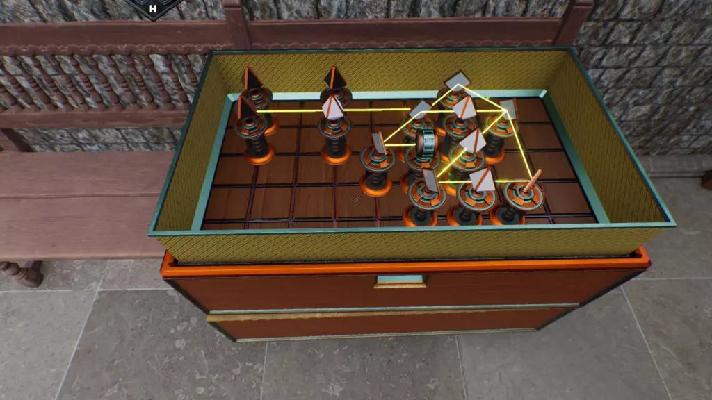 为人体模型着装。 有两个人体模型需要打扮。 一个位于迷宫中心的时装秀场地。由于这个模型是进入房屋的必要条件,这里暂不详细描述(简而言之:给舞台上的人体模型佩戴发夹、腰带,手持雨伞和扇子,这些物品可从无法直接取用的人体模型以及屋顶上获取)。 第二个人体模型在工坊内。 收集所有能找到的帽子(粉色帽子在进入工坊后,箱子后面的柜子里;白色帽子就在旁边的椅子上;蓝色帽子在长桌上的公文包里;紫色帽子在工坊储藏室的窗台上;黄色帽子就在紫色帽子旁边)。收集你能找到的所有鞋子(均位于工坊储物区:进门时架子上的黄色鞋子、正前方门对面的红色鞋子、紫色帽子所在窗台旁的黑色鞋子、画作下方柜子里的米色鞋子,以及无法获取的蓝色鞋子)。 解开庭院和工坊阳台的镜面谜题盒,以获得两条提示和两把钥匙。 谜题盒解法: