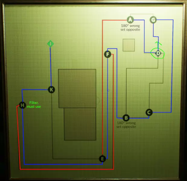 修理花园里的管道。 在温室中,你会发现一张图表和一份“维护说明”被钉在上面。这就是你所需的全部信息,但并非所有工具。 你需要两个大型金属轮来修理两个拆卸下来的阀门。第一个金属轮可以在园丁房后面找到。要取下它,你需要用放在车库窗台上的锤子,从外面就能拿到。另一个大型金属轮位于圣剑和通往起始海岸的红色小径旁。你需要用在车库自行车上方找到的挂锁钥匙才能取下它。 一旦你拿到了金属轮和相关信息,就可以开始修理了。根据维护说明,无论你如何转动D,它总是通向G;H必须包含在内,因为它有过滤器;A和E不相连(管道堵塞);F和H不相连(完全没有管道);A和B的方向完全相反(呈180°错误)。 未明确说明的是,A是水源。 由此我们可以得出: