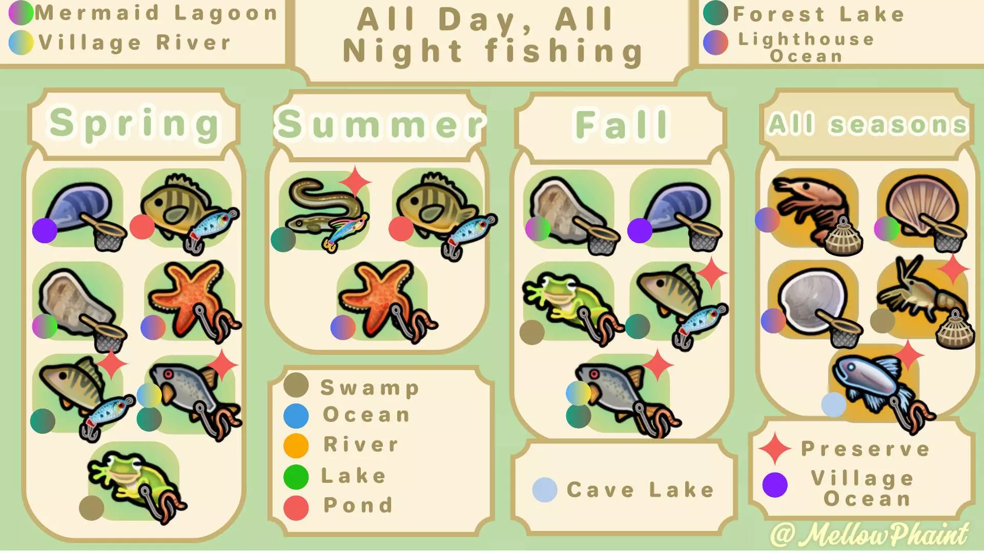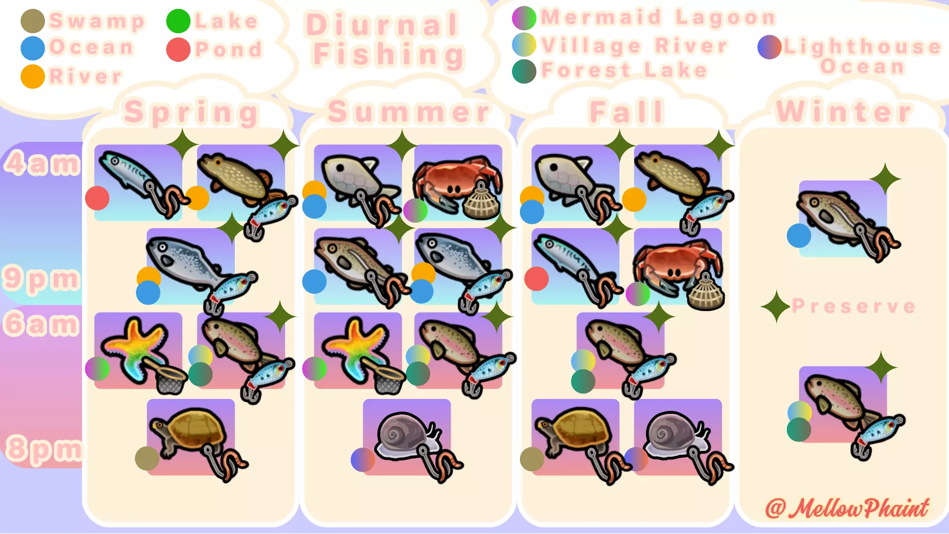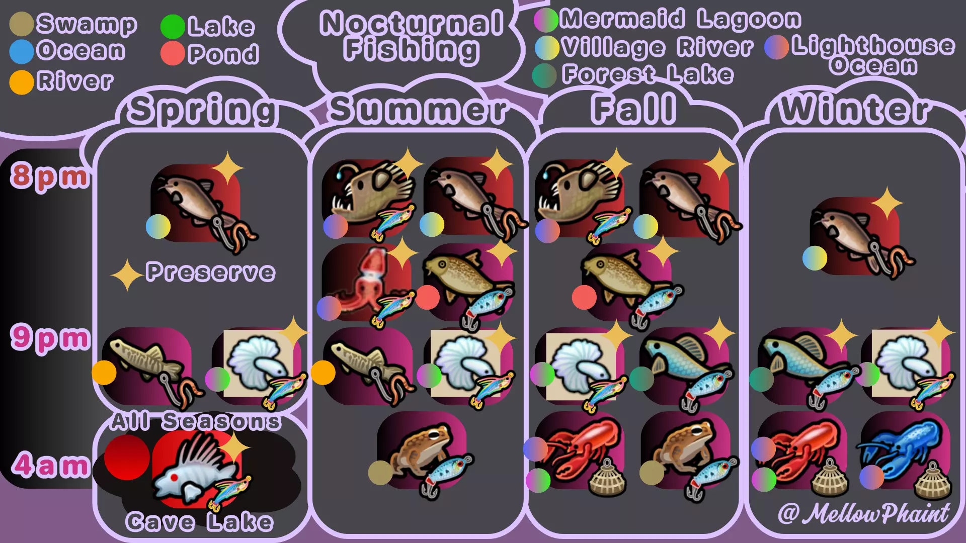 冬季:假设你有一些 drying racks( drying racks)/preserving jars( preserving jars),你就能安然度过整个冬天,因为可以用鱼来填充它们。进行一些采矿,早点上床睡觉,欣赏雪景。 钓鱼:区域似乎分为海洋、淡水(河流/湖泊)、矿山和沼泽。有些鱼据说只能在白天或夜晚钓到,不过我有时也在白天钓到过夜行鱼。你可以在收藏页面(通过家族选项卡访问)将鼠标悬停在已捕获的鱼上查看这些信息,而钓鱼任务通常会说明在哪里可以找到它们。请注意,鲑鱼在秋季会从海洋洄游到河流。收获:灌木丛中的作物/水果/花朵处于停滞状态,其品质计时器不会减少。如果你需要为任务配方/制作收集大量物品,可以让它们一直生长,直到能够一次性收集足够数量。同样,一旦你的作物成熟,即使不浇水也可以让它们留在地里——因此,如果你不急着收获,想留着用于任务或为烹饪同步食材,就可以多开垦一些土地,在其他地方开始种植。 鱼类图表 鱼类图表可帮助你了解鱼类的位置、活动时间以及所需的鱼饵类型。