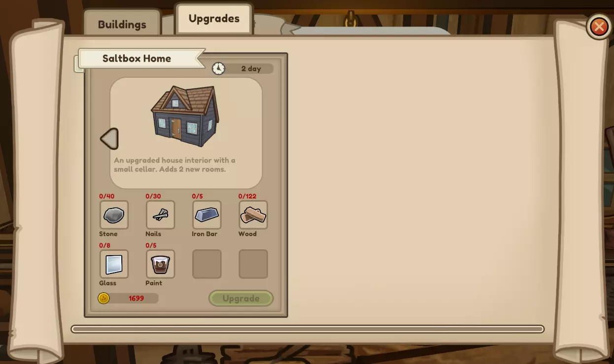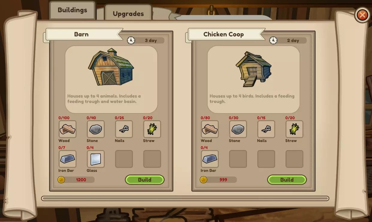 房屋的首次升级包含一个酒窖,酒窖内有一个免费的迷你冰箱,提供8个储物格,物品不会腐烂。这与小冰盒的功能几乎相同。酒窖的第二次升级拥有24个储物格。 在拜访木匠前,请确保你想要建造鸡舍/谷仓/房屋的区域已清理干净,否则你可能需要多次往返。每次升级后,你的房屋占地面积会增大。 建造需求: 鸡舍:999金币、80木材、30石头、15钉子、20稻草、4铁锭。 大型鸡舍:2100金币、59石头、30钉子、160木材、40稻草、3铜锭、4铁锭。 谷仓:1200金币。100单位马德拉木,40单位石头,25单位钉子,20单位稻草,7单位铁棒,4单位玻璃。 大型谷仓:2700金币。57单位石头,30单位钉子,2单位钢条,10单位砖块,200单位马德拉木,4单位玻璃,40单位稻草。 盐盒式房屋:1699金币。40单位石头,30单位钉子,5单位铁棒,122单位马德拉木,8单位玻璃,5单位颜料。 大西洋式房屋:4999金币。57单位石头,50单位钉子,3单位钢条,35单位砖块,300单位马德拉木,20单位玻璃,10单位颜料。