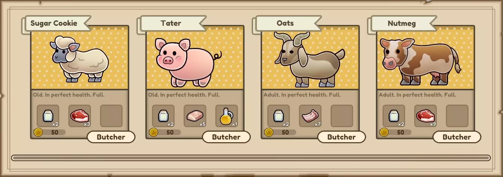 如果你拥有两只相同种类的动物,它们有机会进行繁殖,这样你就能免费获得幼崽! 现在猪会产生粪便,你可以将其放入堆肥器中,如果你关闭了物品降解功能,这会很有用。 双击动物可以更改其名字。 你可以随时与屠夫对话来屠宰你的动物。这会为你提供肉和脂肪——屠夫商店会显示你将获得的物品预览。 冬天你需要有足够的干草来喂养动物。你可以在农场割草并种植苜蓿种子来获取更多干草。一些农场主和动物饲养者也会出售稻草,你可以购买。不过在冬季——这个你最需要稻草的季节,稻草的出售量是有限的。如果你意识到无法让现有的动物种群撑过冬天,最好宰杀或卖掉其中一些,以保证你心仪的动物存活下来。