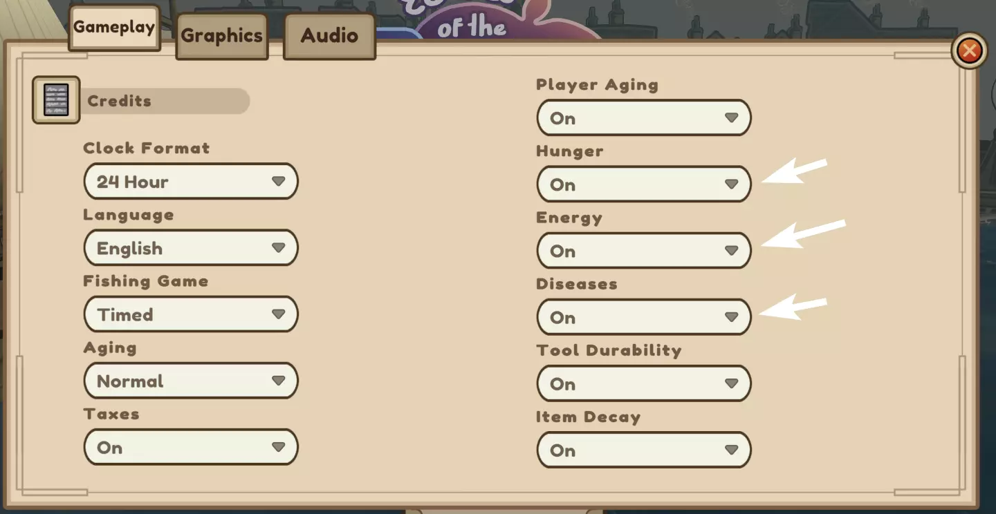 不想为食物、睡眠或疾病担忧?可以在菜单中关闭这些选项。不过我建议开启这些选项进行游戏,因为这会让游戏变得独特且有趣。 可互动的物品会有较暗的轮廓。如果摇晃树木或灌木丛没有任何收获,可能是因为不在正确的季节。