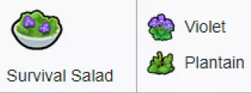 在游戏世界中经过树木时,一定要摇晃它们两次。 木材不仅可用于建造物品,还能为你带来相当数量的金钱——每块木材价值10金币,因此一堆50块的木材就能卖到500金币。如果有需要,这是游戏初期赚取额外金钱的简单方法。 食物 初期简单食谱 生存沙拉(Survival salad):香蕉和紫罗兰(均为采集获得)