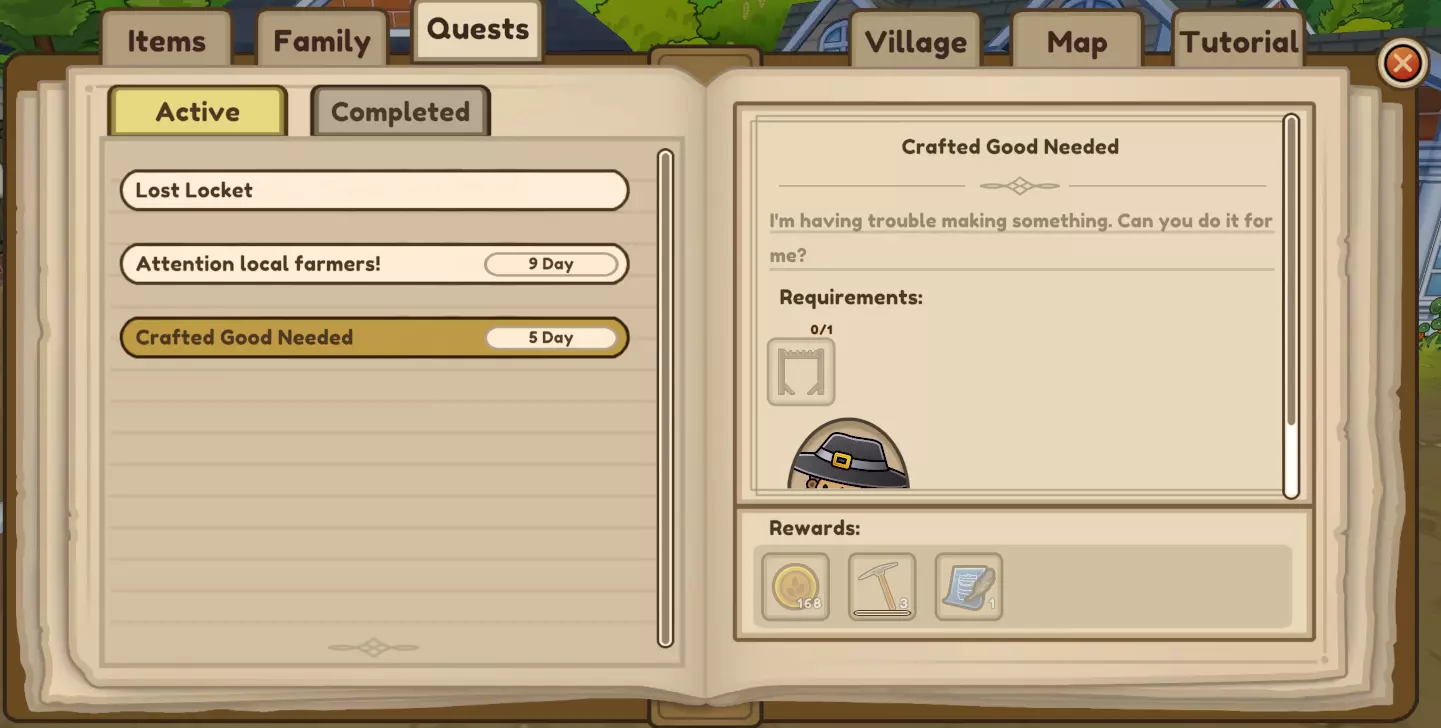 请注意,你经常会接到目前无法完成的任务——它们可能需要非季节性物品、你尚未掌握的手工艺技能/装备,或者需要购买但得不偿失的东西。如果任务实在太难,不必担心拒绝或放弃它。 优先选择提供幼苗或食谱奖励的任务。一旦你有了足够的钱,即使无法制作所需物品,也可以接受这些任务,因为你可以购买所需物品——为了获得幼苗是值得的。 当你拥有任务所需的物品时,该人物的图标会出现在你的地图上。如果他们因生病或其他原因无法到场,任务页面上可能会出现一个图标,允许你通过邮件发送物品,就像你处理税款那样。工具和材料