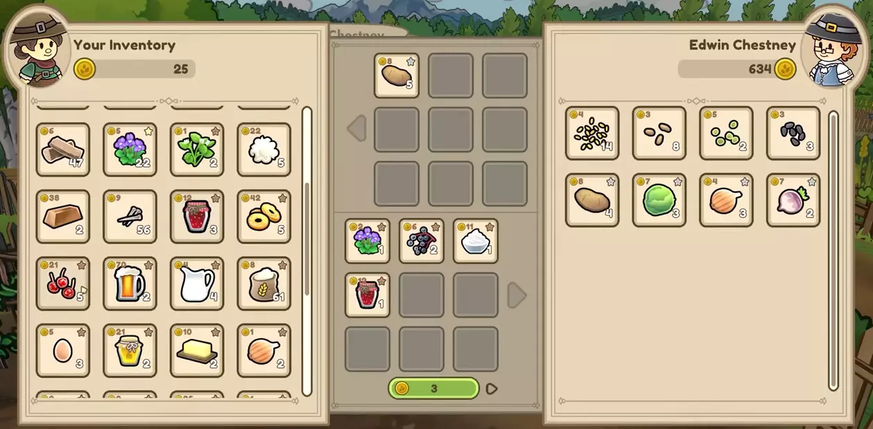 这些食谱能帮助你开始提升烹饪技能。 每次烹饪一个物品,因为批量烹饪不会获得额外经验。 经济实惠(且可持续)的食物获取方式是将水果/蔬菜/鱼放入干燥架或罐头罐中。这样制作出的物品能恢复10-20点饥饿值,并且在背包中能保存很长时间。所需的食材就是你能从灌木丛中采集的水果、菜园里收获的一些作物,或者一些多余的廉价鱼类。如果你有3个干燥架和罐头罐的任意组合,这不仅能满足你的饥饿需求,还能有剩余的食物出售。熟食也能提供加成效果,例如可以提升收集物品的品质。茶和咖啡能为你提供行走速度加成,我认为这是游戏中最实用的加成之一。 种植 你需要种子,这些种子可以向农场左侧田地里工作的人购买。右上角田地和左下角田地的人各自拥有不同的种子库存,并且他们的库存每天都会更新,所以如果你在寻找不同的种子,可以回去查看。完成镇长的“认识村民”任务,你还能获得许多初始种子。