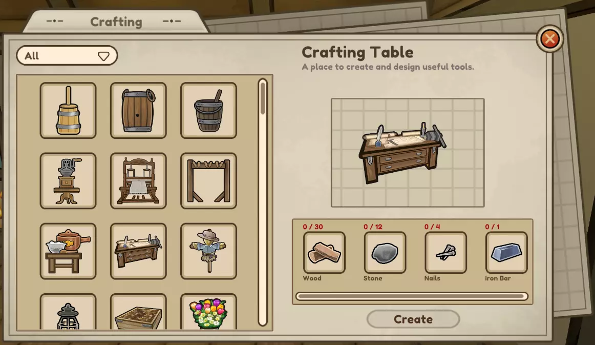 有时你需要将多个物品放入工匠设备才能使其运作——例如,将3个小麦放入面粉磨坊以获得面粉,将3个铁矿石放入熔炉以获得铁锭。 许多你可以制作的物品,如稻草人、药草园和花园,完全是装饰性的。它们看起来很不错,但你不必急于放置稻草人来保护你的作物。 不要认为你需要制作所有东西!你会获得一个制作站,因此你可能会认为需要大量制作才能获得所需的所有物品——就像你在其他农场游戏中所做的那样。 但《 plum grove的回响》做得很好的一点是,它强调你的初始角色是一名农民。你没有能力或设备来制作自己的铁钉,即使你在很多事情上都需要它们,而且你的第一反应是应该自己动手制作。 但首先你需要解锁铁砧(需要6级制造技能或完成一个任务)和熔炉。这需要一些时间。所以,接受这个设定吧。先当个农民。去铁匠铺买铁钉。一开始可能觉得很贵,但很快你就会有很多钱了,而且你并不着急。逐步建立你的制造帝国——你的孩子总能完成你没能做到的事情。 木匠