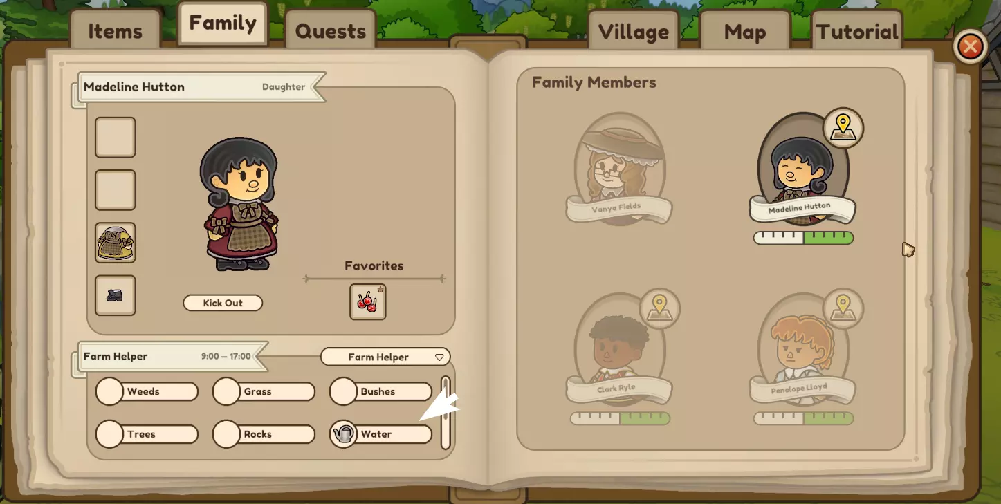 在配偶/子女的下拉菜单(可在家庭标签页中找到)中选择农场帮手后,你可能需要取消勾选除浇水外的所有选项,以确保他们专注于浇水,不会因拔除杂草而分心。 农场帮手,尤其是儿童,每天的工作时长有限,因此要确认在此期间所有作物都已浇过水。成年人的工作时间为9点至17点,儿童为9点至15点。 农场帮手在周日休息,所以你需要亲自浇水。如果你的农场太大难以打理,可以让作物在白天干旱,只要确保第二天能及时浇水即可。动物创造