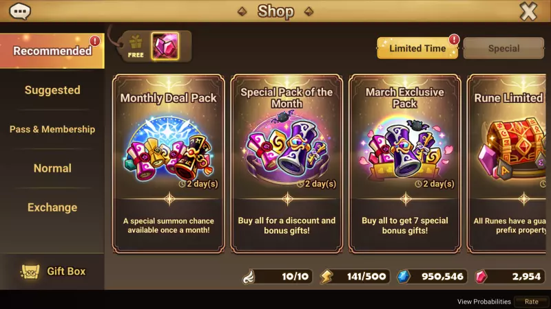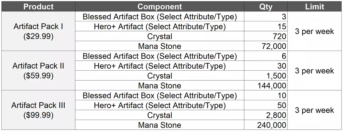 :祝福神器箱 你可以在属性/类型中进行选择,并在选择获取前预览三件6★传说神器的信息。 :【推荐>特别】特别专属礼包I、II、III已限时添加。 * 销售时间:3月30日v9.1.7更新后 - 5月31日晚11:59(服务器时间)