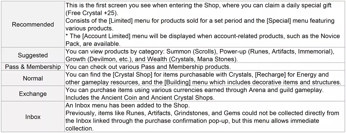 《魔灵召唤:天空之役》商店更新内容 1. 每月特惠礼包是每月最多可购买10次的购买福利商品。此前,购买单独的堆叠/袋/盒/箱装商品可获得福利,现在将仅通过每月特惠礼包提供。 2. 下架商品 - 常规商品:【属性神器包/类型神器包/恶魔怪特别礼包/符文拆除包】 - 轮换商品:【3个特别礼包/能量、魔力石包/魔灵成长包】 3. 其他商店变更 - 所有商品的购买限制显示将统一为【已购买次数/购买上限】。(每次购买后数量会增加,例如:购买1次后从0/2变为1/2。)▶ 岛屿左侧的【会员】图标已优化,便于延长会员权益。 ▶ 指环王联动结束 - 指环王联动活动预计于PDT时间4月1日7:59结束。 - 请务必在联动活动结束前领取所有未领取的奖励。 * 与指环王联动角色具有相同属性和技能的原生魔灵将于五月下旬添加。 ▶ 其他改进与变更 - 【战斗训练场】模拟战斗24 - 半人马骑士的魔灵组合和通关条件已调整。- 在世界公会战等特定玩法中,当使用炼狱(2A)等体型较大的友方魔灵时,敌方魔灵的增益/减益图标此前会被遮挡,现在这一问题已得到优化,可更清晰地显示。 - 【成就>竞技场】部分成就条件的描述文本已调整。 :关于【荣耀的代价】成就,此前使用荣耀点数至少购买过一次随机天使怪道具的召唤师,将自动完成该成就。