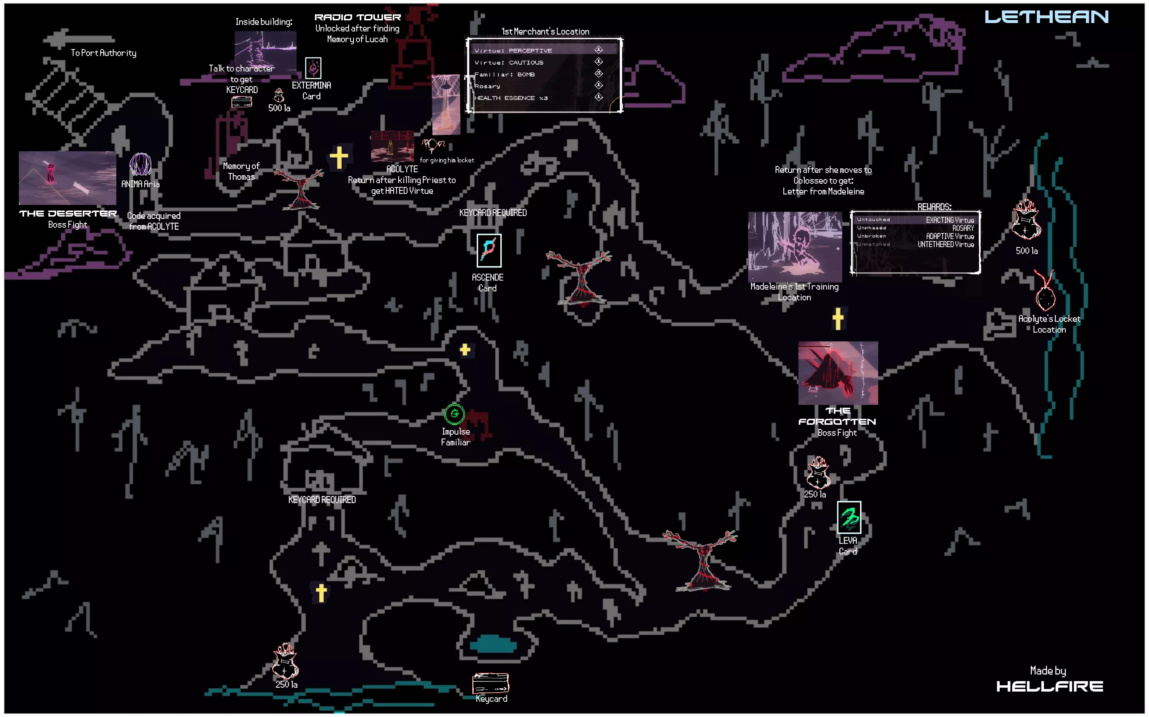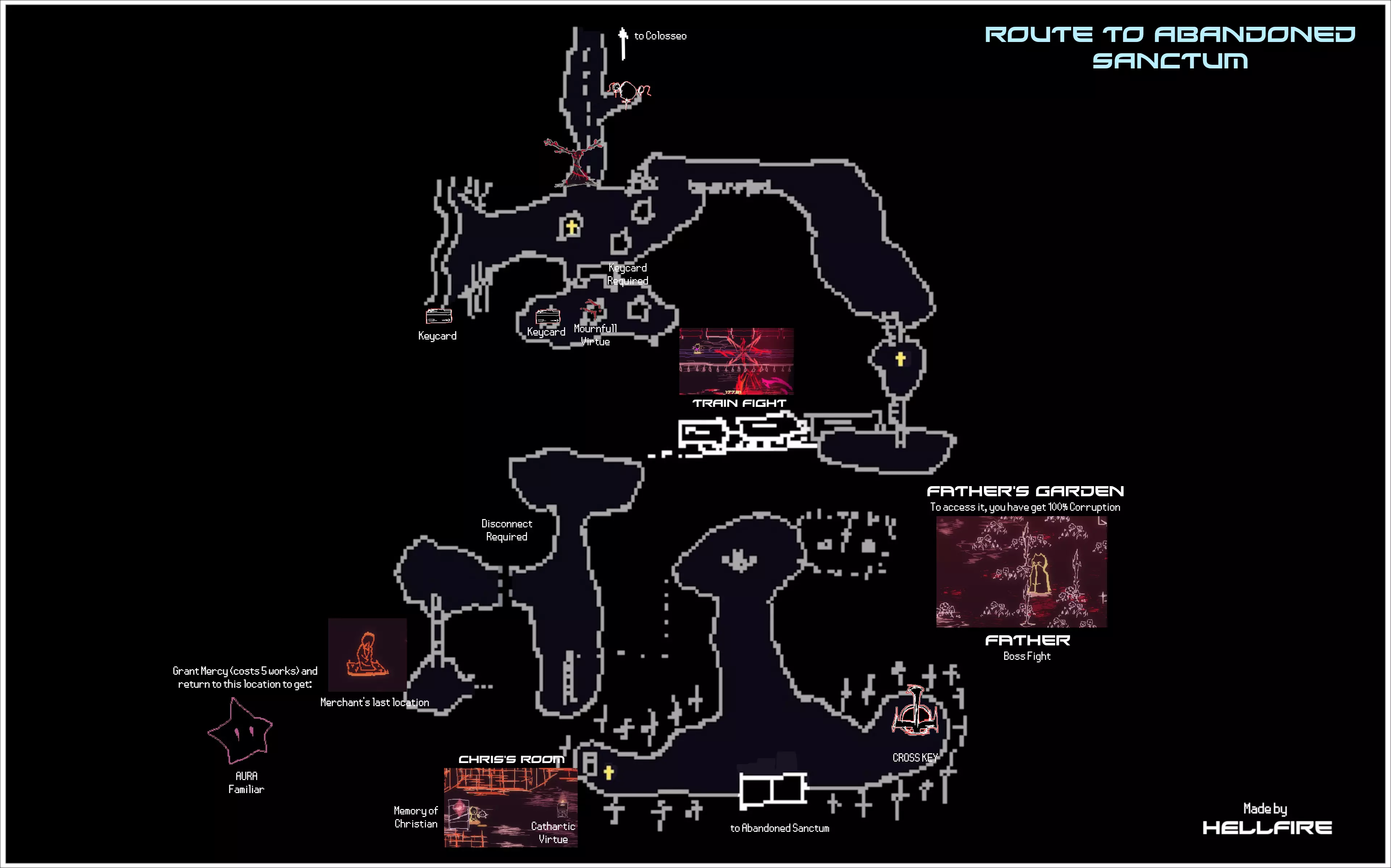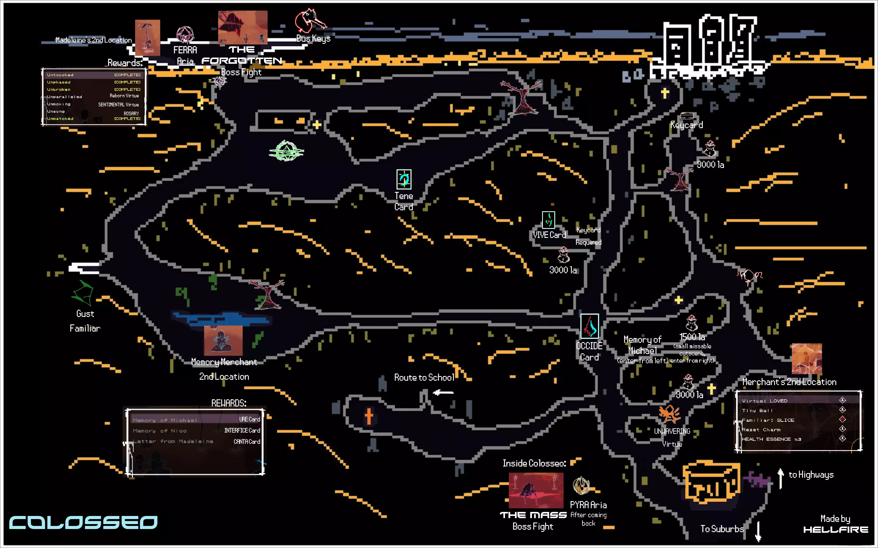 本指南旨在收集《梦碎之境》中所有物品的信息,同时也想列出所有咏叹调共鸣。目前本指南仍在制作中,因此还有许多信息缺失。 简介 本指南包含游戏中所有美德、咏叹调、伙伴、祈祷卡和记忆的相关信息。 你可以在地图上查看所有物品的位置。指南中还包含任务及其推进方式的信息。 本指南未包含解锁【Haunted】成就所需的所有敌人信息,但如果你完成所有任务并通关游戏,该成就将会解锁。 请注意,本指南包含游戏区域的全部剧透。尽管游戏本身并不侧重剧情,但其中展示了关于 Boss 的信息,可能会通过画面内容剧透游戏。 初始阶段 以下是游戏初始阶段即可获得的物品列表以及地图相关琐事。 初始可用 SOL Aria 激光伙伴 可按指令发射强力激光。 美德 不屈 [1 VP] 每场战斗可承受一次致命伤害而不死。通过【回溯】或完全治疗重置效果。 教程结束后: 美德 宣泄 [2 VP] 受到伤害后的短时间内,造成伤害可恢复失去的生命值。 克里斯蒂安的记忆 地图上的常见物品