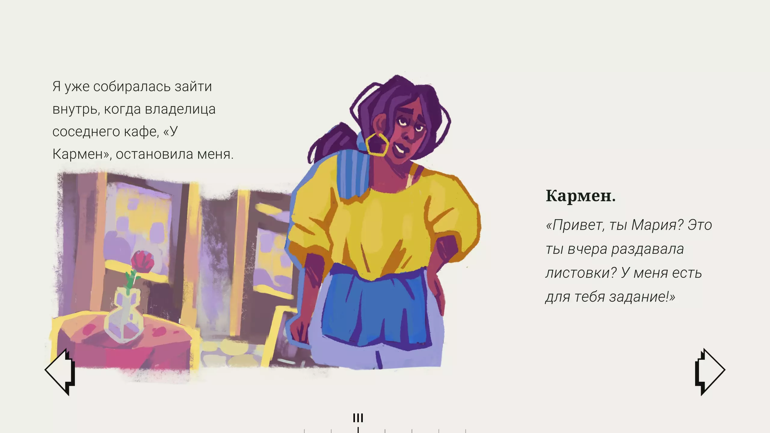 咖啡馆的老板娘卡门非常热情。 这个女人起初给人的感觉有些冷淡,不太喜欢胖人,但我有一个很棒的朋友,她的体型丝毫没有影响我对她的喜爱。这完全取决于个人。 卡门也是如此,她其实是一位极好且内心丰富的女性。但能感觉到,她对自己的生活并不完全满意。姐姐海伦总是冲在前面,还不断催促她,这让她无法发挥自己的潜力。而玛丽亚一如既往地在她身边,不仅帮她修理物品,还帮助她了解自己。