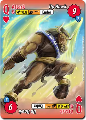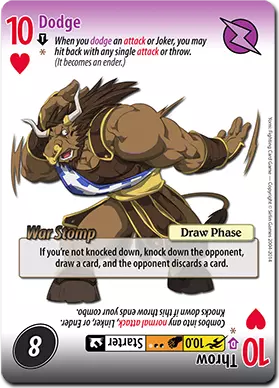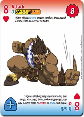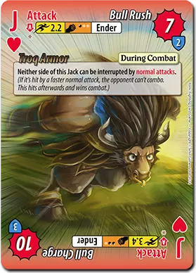 特罗克的面部卡牌都具有很强的实用性。首先,他的J攻击【公牛猛冲】单卡拥有2.2的可观速度和7点伤害。作为终结技,它的伤害永远不会超过7点,但能压制许多其他攻击,让特罗克施加一些压力。 【公牛冲锋】速度慢得多,为3.4,但能造成10点伤害。大多数情况下,它的主要用途是当特罗克没有其他后续招式时,衔接在普通攻击连招的末尾;或者在特罗克尚未完全成长时,作为闪避后的后续招式。 这些卡牌的实用性不止于这两种不同的攻击。它们还拥有特殊能力【特罗克护甲】(也许特罗克从鬼丸那里学了一两招),该能力使此卡牌的正反两面都能克制速度更快的普通攻击。这使得【公牛冲撞】能够被用于对抗那些喜欢频繁进行普通攻击的角色。