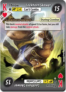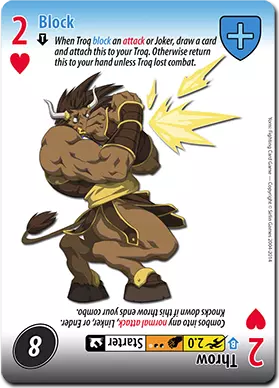 特罗克凭借他的【锁角穿刺】投掷技,继续在普通攻击中占据优势。其特殊能力是能够克制速度为5.0或更快的普通攻击。对手若想伤害特罗克,需要使用比“懦弱普通攻击”更强的招式。 【锁角穿刺】是一张非常出色的卡牌。作为一张速度2.4的投掷卡,它能抓取快速普通攻击,还能造成15点伤害?特罗克会尽可能多地使用这张卡。