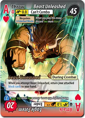 特罗克的【鹰之图腾王牌攻击】保持着出色的速度。该攻击需要两张王牌,但能造成20点伤害,且拥有至关重要的1.0速度。这是特罗克最可怕的技能之一。对手对该攻击的畏惧可能会让特罗克获得更多投掷胜利。当特罗克完全成长后,一次投掷胜利造成的伤害与【鹰之图腾】相当,因此要充分利用这种威胁。 特罗克的【野兽释放超级投掷】是他伤害最高的招式(所有摔跤手角色都是如此)。这是一个速度为0.0的投掷技能,消耗三张王牌可造成45点伤害!这伤害非常可观,尤其是特罗克能让对手陷入致命的闪避/超级投掷择中,如果他操作得当,对手将无能为力(除非他们有王牌)。“野性释放”有一个缺点,它需要特罗克拥有两个已附着的方块,并且当他使用该技能时,会将这两个已附着的方块都收回手牌。这意味着特罗克需要花一些时间来准备释放“野性释放”,而且如果第一次没能成功释放,他很少有第二次机会再使用这个技能。