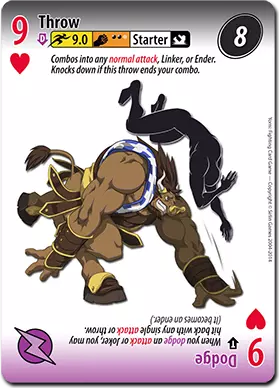 左侧的卡牌是特罗克最快的普通投掷技,其速度确实很快。以2.0的速度,它几乎能超越游戏中所有其他投掷技。特罗克还拥有高等级的普通攻击。不过他的普通攻击速度较慢,结束帧数为0.8。特罗克的投掷技尤其令人兴奋的一点是,这是他利用自身天赋的最简单方式。如果特罗克使用投掷技后接8级普通攻击,并且处于完全成长状态,他将对对手造成20点伤害。对于一个拥有如此快投掷技的格斗家来说,这非常惊人。