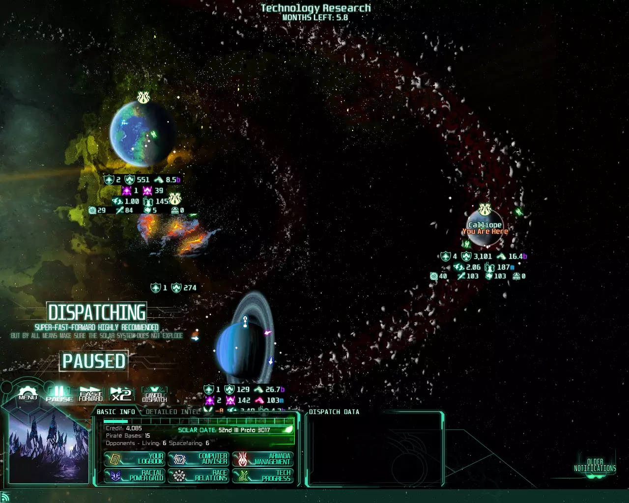 在此菜单中,你可以看到舰队实力从1到100不等,右侧数值是AI海德拉舰队的相对值,已添加科技修正。 3)初始舰队不会移动,这是因为防御舰队的被动效果会使其获得2倍加成,一旦移动,该加成将消失。 从截图中可以看到,我的主星名为卡利俄佩,舰队火力为900,而其他舰队在满功率时均为450,因此你必须始终保留1支舰队防守母星,以抵御AI。 策略 1)你从一个弱小的星球和少量机器人开始,因此必须首先与至少1到2个关系值至少为+50的势力结盟,条件是它们通常只有1颗星球。通常我会选择埃夫克人和佩尔蒂安人,原因我会在后面解释。2) 一旦你获得了这些盟友,就可以按照以下非常重要的顺序开始征服: - 首先占领已被摧毁的海德拉星球(奖励:你的星球获得1.5倍加成,其他势力难以获得反制建筑,轻松获利),不要让任何人夺回它,这是复仇的第一步。 - 你需要资金,摧毁那些海盗基地很容易获得3500信用点,相当于3.5个月的研究经费。 - 占领那个夺走海德拉星球的势力的星球,复仇迫在眉睫!