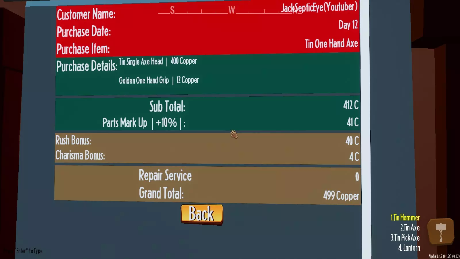 魅力值和加急奖励(即你完成顾客订单所花费的时间)将是对价格产生最持续影响的因素。 提前制作好武器待售有助于最大化加急奖励。有一些帖子称,提前制作的武器售价低于接到订单后才制作的武器……目前尚未经过测试。 将提前制作的武器放在顾客附近可能会导致顾客偷走武器,并且只支付很少的钱甚至分文不付。这一点已得到证实,武器甚至不需要离顾客很近——有个小混蛋竟然偷走了房间另一头的匕首…… 在铁砧上提升品质的小游戏可以重复进行,我记得是5次,每次提升的效果都会叠加在前一次之上,所以如果你操作得当,可以为武器品质增加25点。这对于武装你的冒险者来说非常重要。矿石等级排序:煤炭/碳 -> 铜 -> 锡 -> 青铜 -> 锌 -> 黄铜 -> 铁 -> 钢 -> Adelite -> 秘银 -> 精金 -> 钛 据称你可以向顾客出售比其要求低一个等级或高一个等级的武器。经过测试:当顾客要求购买铜斧时,向其出售了锡斧,但顾客为锡斧支付的价格与铜斧相同。因此,我浪费了锡锭,却只得到了铜锭的价格。
