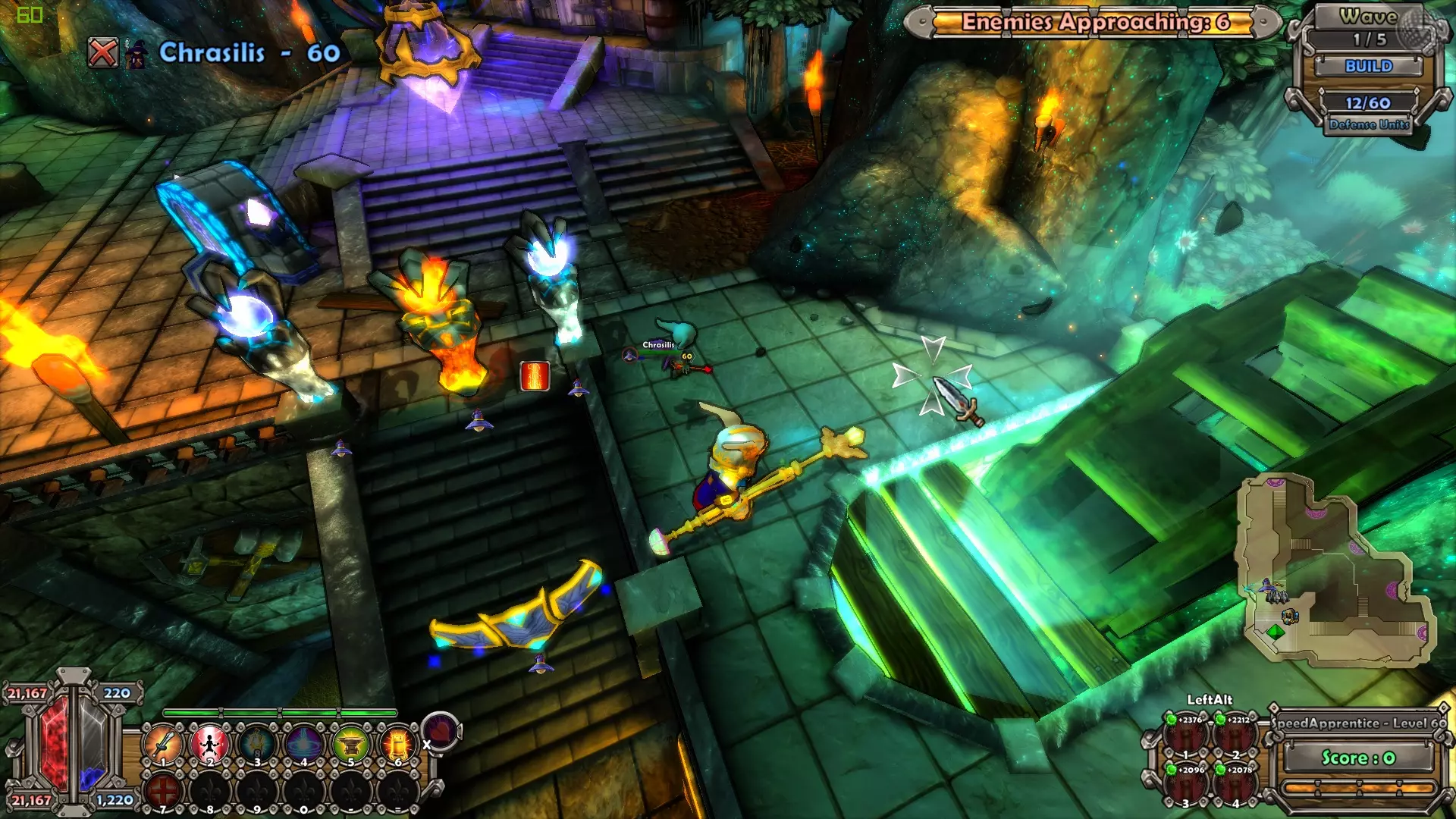 过载(4秒冷却/激活时消耗魔力)- 法师的防御技能(英雄等级5级解锁),过载是一种主动技能,以快速增加的魔力消耗为代价,大幅提升英雄的施法速度。这使法师能够以极快的速度建造、升级和自我治疗,在游戏前期非常实用。不过在更高难度下几乎没有用处,因为优质装备提供的英雄施法速度加成已足够让所有操作接近瞬时完成。