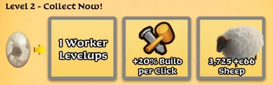 更优秀的工人!你可以选择升级哪些工人。如果你刚开始游戏,要留意属性的提升,这样才能负担得起工人的费用。点击通知界面中的奖励时,你会看到所有工人的属性,以帮助你做出选择。 每次点击的建造速度提升20%,这会让你每次点击都能更快地建造。这与升级获得的奖励相同。 你需要绵羊来收获羊毛,而羊毛是制作布料的原料。由于羊毛的数量没有上限,每次羊毛可用时进行收获是获取经验的好方法(想想升级吧!)。记住,你需要羊毛来建造酒馆和赚取更多金币。 等级3