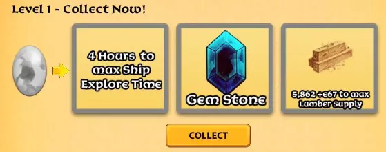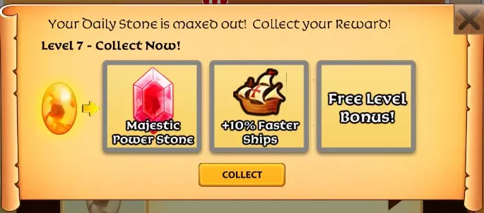5级可获得2颗宝石,而1级仅能获得1颗。 稀有宝箱内含5件物品,其中包括经验值。你会获得材料、宝石、藏宝图、蓝图还是另一颗每日宝石呢?无需航行即可开启宝箱。 稀有时间石!可进行4小时的时间旅行。让你的船只在数秒内而非数小时内满载而归。如果你有工人在建造、航行、提炼或采矿,请记得准备好金币! 6级