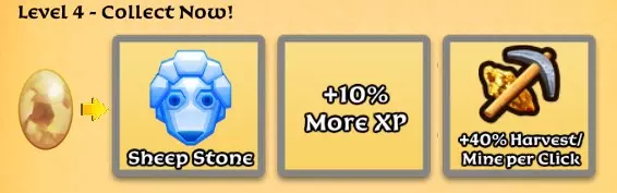 4级有丰厚奖励。【绵羊石】在你收获羊毛后会重新填满绵羊数量。 每次点击可多获得10%经验值,助你更快升级。 每次点击额外增加40%收益,能让矿山、绵羊和伐木场更快清空,这相当于两次升级加成。 想要更稀有的奖励?升级到5级吧。 5级