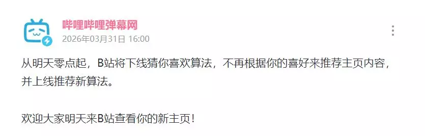 B站发文宣布:“4月1日凌晨0点起将下线猜你喜欢算法。” 官方表示不再根据用户喜好来推荐您的主页内容,此外还会上线全新推荐算法。