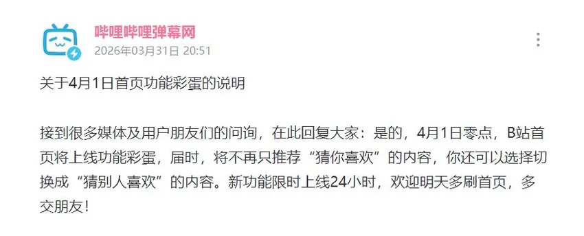 B站将于4月1日0点上线限时24小时的首页功能彩蛋“猜别人喜欢”,届时用户可在首页切换内容推荐模式,从“猜你喜欢”切换为“猜别人喜欢”。