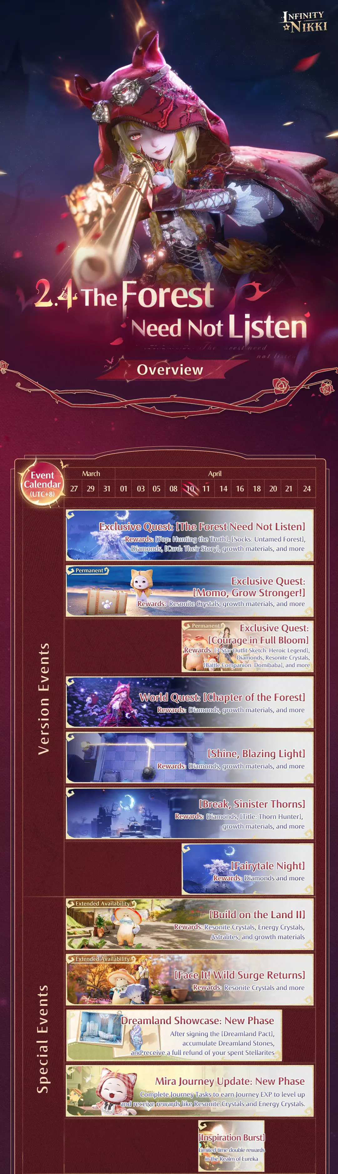 《无限暖暖》2.4版本【森林不必倾听】修复公告 ■ 2026年3月26日更新内容 ★ 修复问题 ★ ● 修复了饰品【缠绕藤蔓】与部分袜子(【寻光】、【寻光:绯月】、【夜之银】)搭配时可能出现的显示异常问题。 ● 修复了部分【小礼物】可能出现显示异常且无法交互的问题。 ● 修复了发型【时间信号】部分区域显示错误的问题。《无限暖暖》修复公告 1. 修复了套装【幻色凡尘心】在【衣柜】界面中全套妆容显示异常的问题。 2. 修复了颈饰【心之呼唤】可能出现材质异常显示的问题。 3. 修复了连衣裙【晨曲再临】部分区域染色效果显示异常的问题。 4. 修复了合作模式中,若一名搭配师佩戴发型【黎明未至】,另一名搭配师的角色模型可能显示异常的问题。 5. 修复了PS5平台上,在【浴室】界面选择【已激活方案】无法跳转至【方案手册】的问题。《无限暖暖》修复公告 1. 修复了穿戴【墨墨的斗篷:福运自来】或【墨墨的斗篷:低调行事】时使用【默认:缩小】能力可能导致显示异常的问题。 2. 修复了使用【潮汐哀歌:世界律动】能力后,袜子【碎裂贝斯】可能出现显示异常的问题。 3. 修复了装饰【螺旋风帆】在打开并退出【灵感迸发】界面后可能下沉卡住的问题。 4. 修复了拍照道具【精灵的恩赐】获取后显示异常的问题。更新后,已领取该奖励的搭配师可在【墨墨相机】中使用。 5. 修复了在特定条件下装备多个面部装饰时,染色方案可能显示错误的问题。《无限暖暖》更新内容 1. 修复了【千风之袜】在特定条件下搭配某些身体彩绘时,非重叠部分可能无法显示的问题。 2. 修复了完成龙泪任务后,与【祝福图鉴】进行异常交互可能导致在特定条件下无法解锁对应条目的问题。 3. 修复了在特定条件下,使用【制作台:扩展】制作家具时材料追踪可能出现异常的问题。 4. 修复了【绯红之梦】连衣裙在特定条件下部分区域染色效果显示异常的问题。《无限暖暖》修复公告 1. 修复了在特定条件下使用【精灵:动物护理】能力后切换界面并退出,可能导致游戏无响应的问题。 2. 修复了在特定条件下装备特定套装或服装部件后,默认动画可能显示异常的问题。 3. 修复了在特定条件下上衣【无瑕代码】部分区域染色效果显示异常的问题。 4. 修复了在特定条件下连衣裙【岁月长流】部分区域染色效果显示异常的问题。 5. 修复了在【衣橱】界面切换自定义外观时,在特定条件下可能导致异常卡顿的问题。《无限暖暖》修复公告 1. 修复了在特定条件下,于星之海区域跳跃时椰子掉落,但暖暖仍保持手持椰子动画的问题。 2. 修复了PS5平台在特定条件下,部分页面快捷键可能停止响应的问题。 3. 修复了世界任务【旧泪重流:角斗场】在特定条件下,收集纹章后可能无法继续推进的问题。 4. 修复了【无限之心】界面在特定条件下,缩小后部分进度指示器显示不正确的问题。