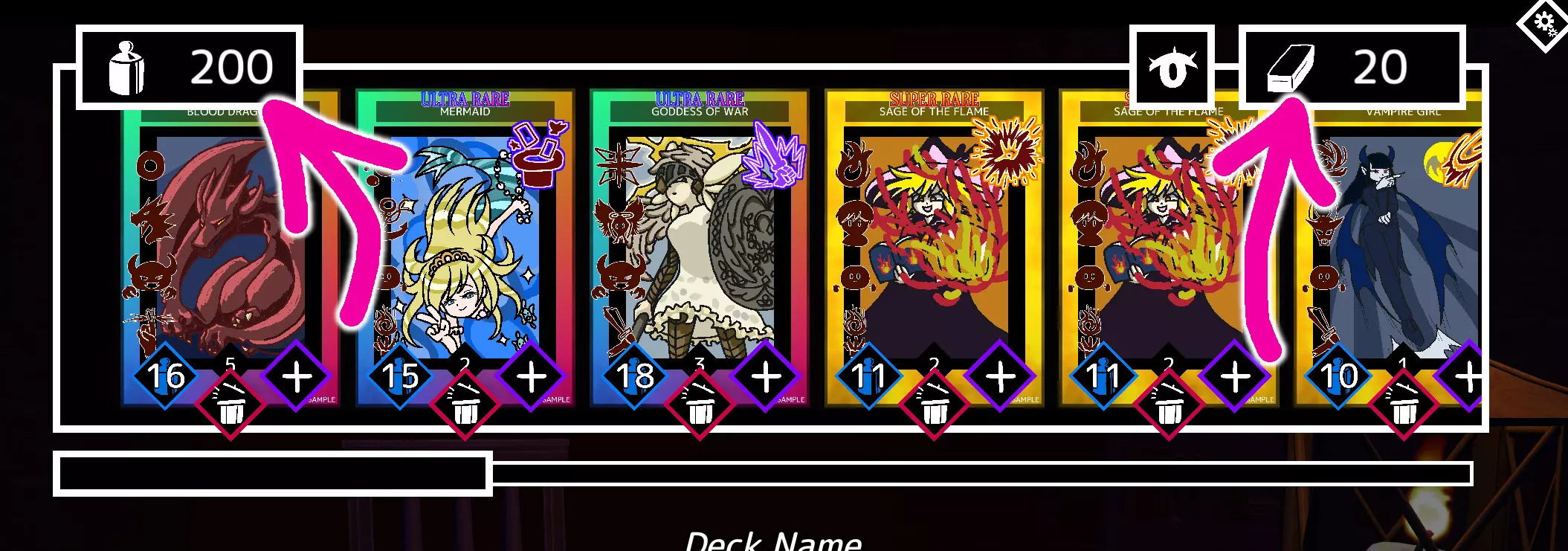 游戏房主可以选择更改费用上限和卡牌数量限制,默认费用上限为200,卡牌数量限制为20,这意味着平均每张卡牌的费用为10。 影响费用的因素有哪些? 稀有度: 普通(C):4费用 稀有(R):5费用 超稀有(SR):7费用 特级稀有(UR):11费用 技能类型: 无技能:0费用 弃牌:1费用 标准:2费用 游戏改变者:4费用 伤害: 1点伤害:1费用 2点伤害:2费用 3点伤害:3费用 4点伤害:4费用 5点伤害:5费用 这意味着你能为卡组制作的最低费用卡牌为5费用(普通、无技能、1点伤害:4+0+1=5),最高费用卡牌为20费用(特级稀有、游戏改变者、5点伤害:11+4+5=20)。以下是我注意到的关于费用值的一些有趣内容: - UR品质的诡计技能加成会根据费用值来判定哪些是【最强】和【最弱】的卡牌。 - 所有D级卡牌,例如中毒或诅咒,仅会因其伤害费用而提升(即便它们拥有弃置能力)。 - XR稀有度的费用似乎为19,你可以通过进化技能和挑战者技能获得该稀有度。 - 刺客技能会依据费用来选择要弃置的卡牌,这意味着它有助于从你的手牌中移除陷阱或中毒卡牌。 - 融合卡牌的最终结果不会因其拥有2个能力而获得额外费用(我对融合机制不太熟悉,还需更多测试)。