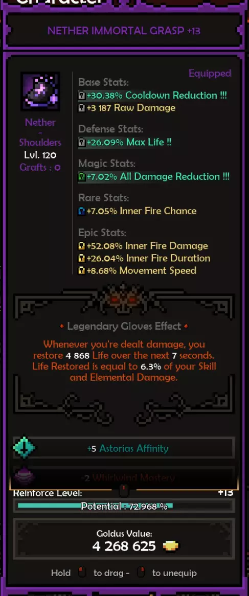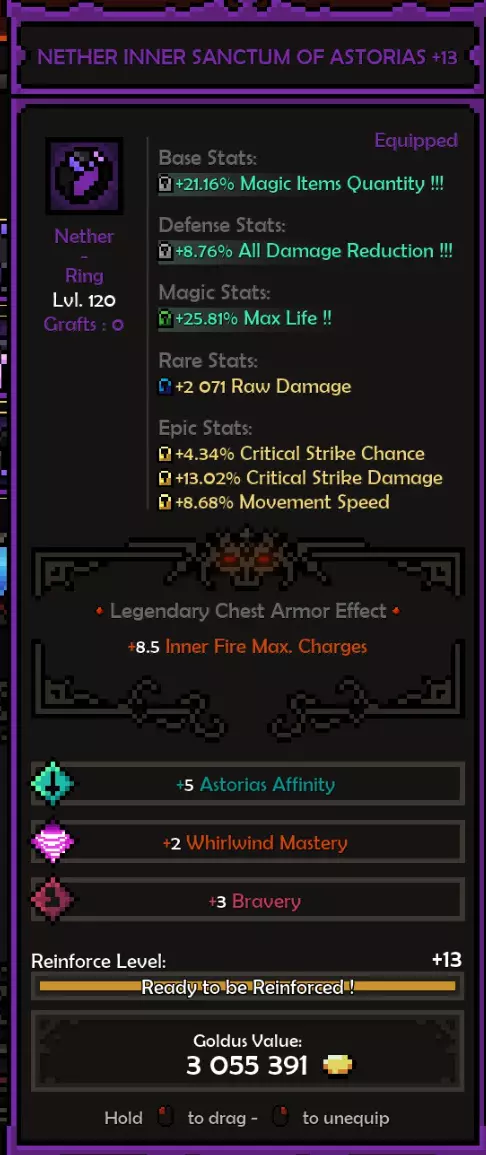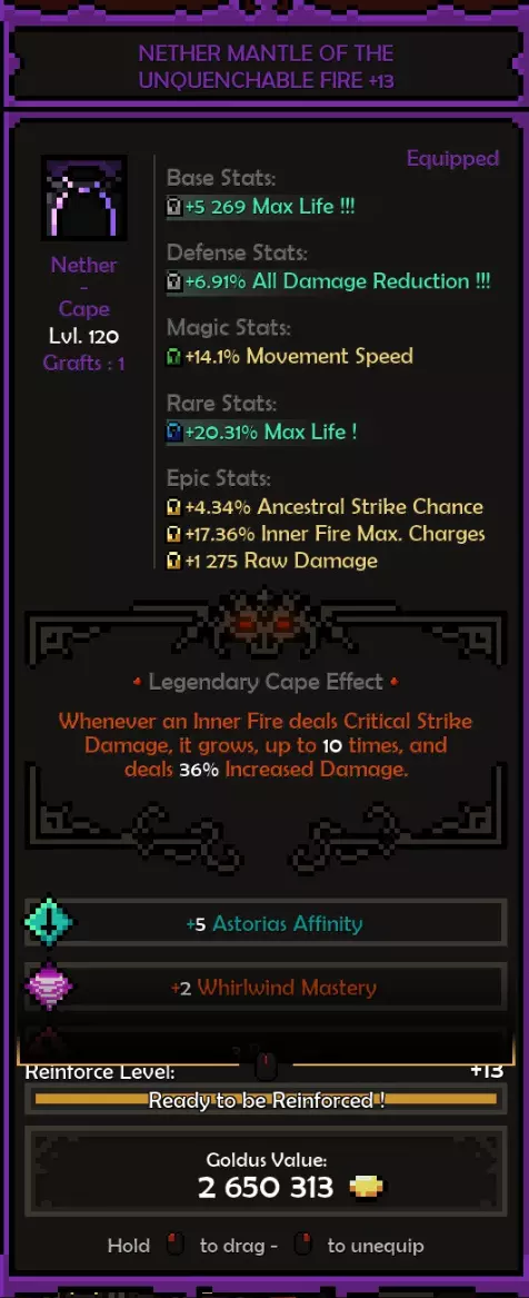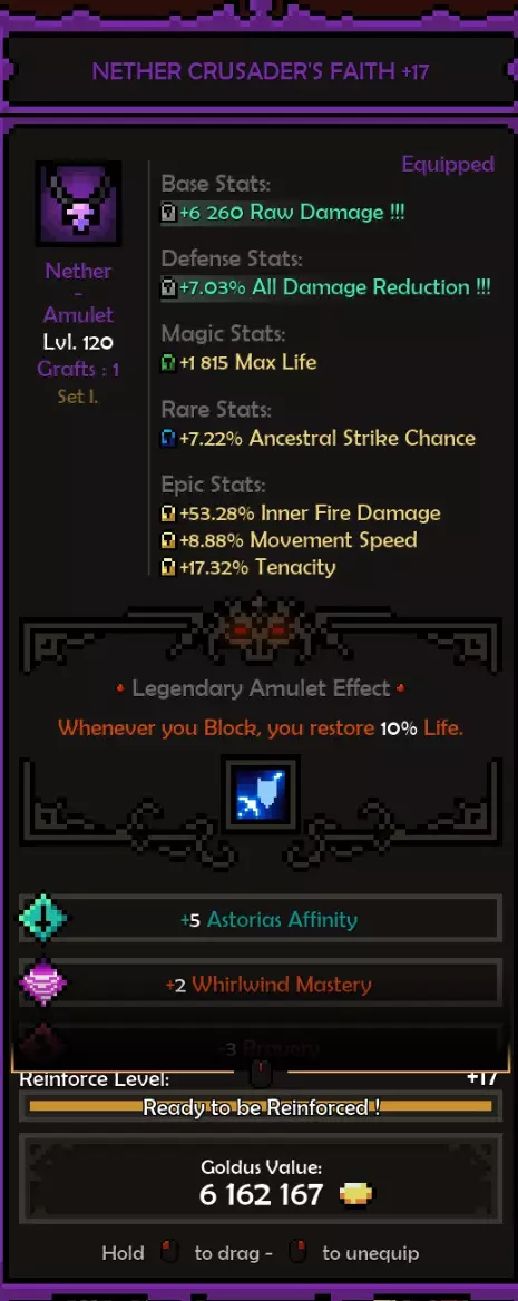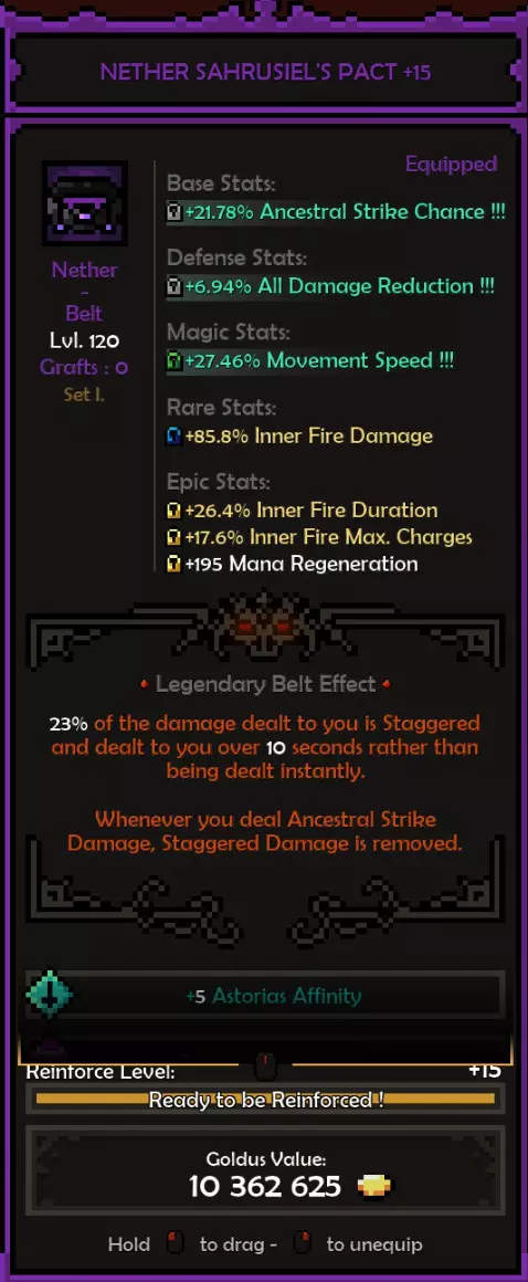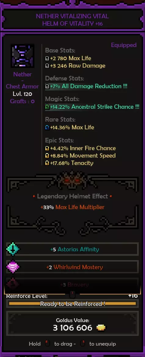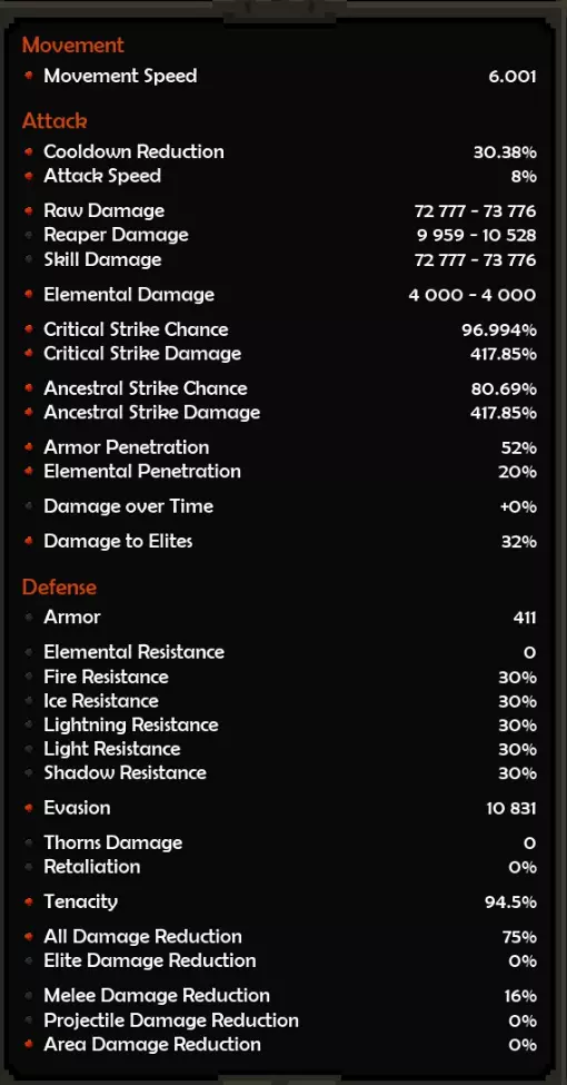 死神亲和:阿斯托利亚斯 精通属性:旋风 属性:残暴或勇气 推荐属性 基础属性: 最大生命值(数值)而非百分比,除非百分比提供的数值高于固定值。 原始伤害 先祖暴击率 暴击伤害 防御属性: 全伤害减免 理想情况下,你拥有全套暗影装备,并在防御属性上全部嫁接伤害减免。 这样做,你可以将全伤害减免最大化(75%)。 要做到这一点,你需要前往原始暗影界,找到一个带有全伤害减免纯属性加成的关卡并反复刷取。重要的是不要完成该关卡,直接离开,这样你就可以不断重复该关卡来获取装备。我还建议将筛选器设置为“仅显示带有纯属性、最高属性评分且已高亮的装备”。你可以通过点击角色面板上的属性来高亮显示该属性。 你可以将闪避率作为过渡属性,但闪避率存在严重的收益递减问题。我认为不可能达到100%闪避率,而且你无法躲避范围攻击,所以它并不值得投入。我确实在头盔上附加了最大闪避率,因为一定的闪避率还是不错的,但不值得专门去堆。 魔法/稀有装备: 你可以选择任何你想要的属性。 获取1条生命和法力吸取属性。 最大生命值 先祖打击几率 内心之火伤害/持续时间 暴击伤害 内心之火触发几率(尽量达到至少35%) 1或2条移动速度属性会很不错 史诗属性: 内心之火最大充能层数(优先选择,因为最大充能层数等于来自死神 bonus的持续时间)。而持续时间等于伤害,这得益于我们披风的传奇效果。内心之火伤害 内心之火持续时间 原始伤害 暴击伤害 1或2个坚韧属性 装备搭配建议: 每件装备都应在防御属性上达到最大全伤害减免 之后再进行其他选择。我的部分装备嫁接了传奇效果 根据需求选择属性。建议优先考虑最大生命值(固定值)、先祖打击几率、原始伤害、暴击伤害。在伤害和生存能力之间找到平衡 补充一点,我的最终选择是法力回复。你也可以选择区域伤害减免或其他任何属性 我的做法是,先确定想要优先提升的属性或该类别中最佳的属性,例如基础属性中,我优先选择最大生命值和原始伤害而非暴击伤害等。然后可以通过嫁接系统决定要替换或提升哪些属性 我的所有属性