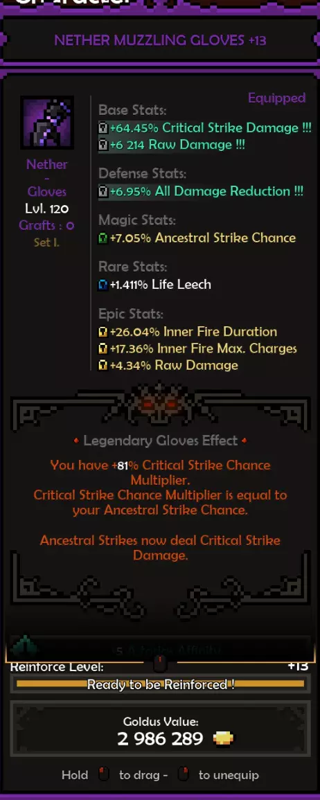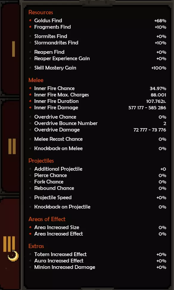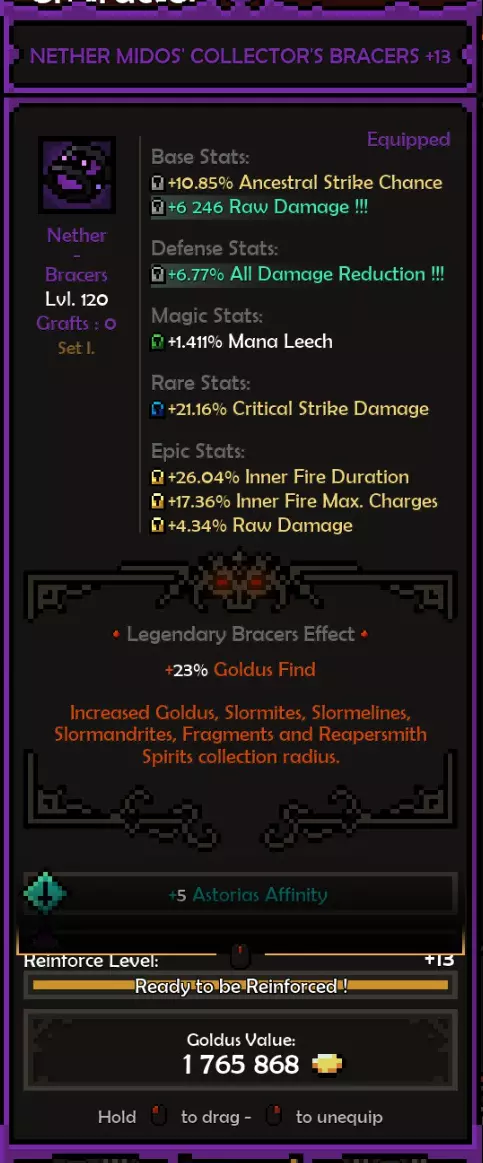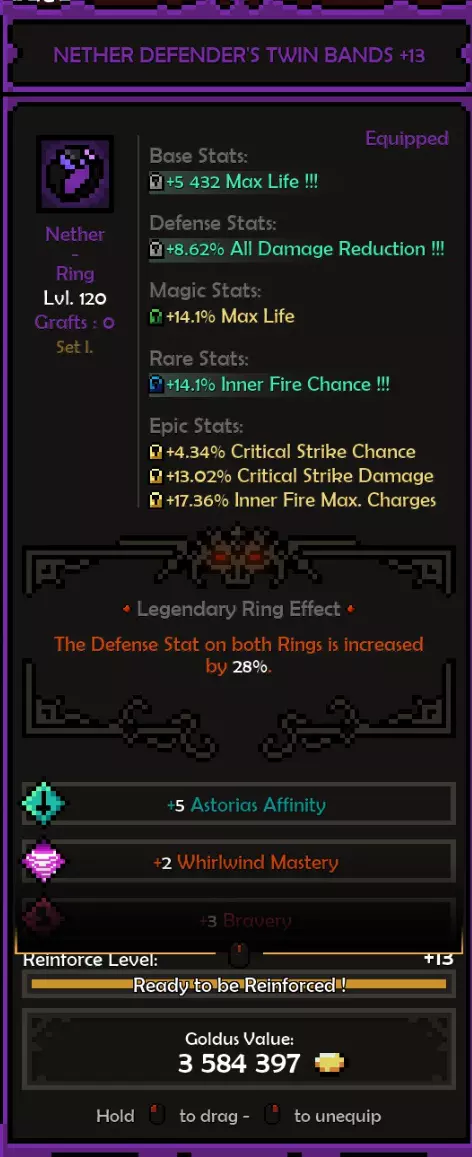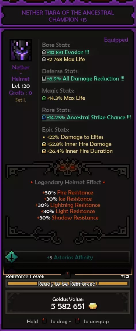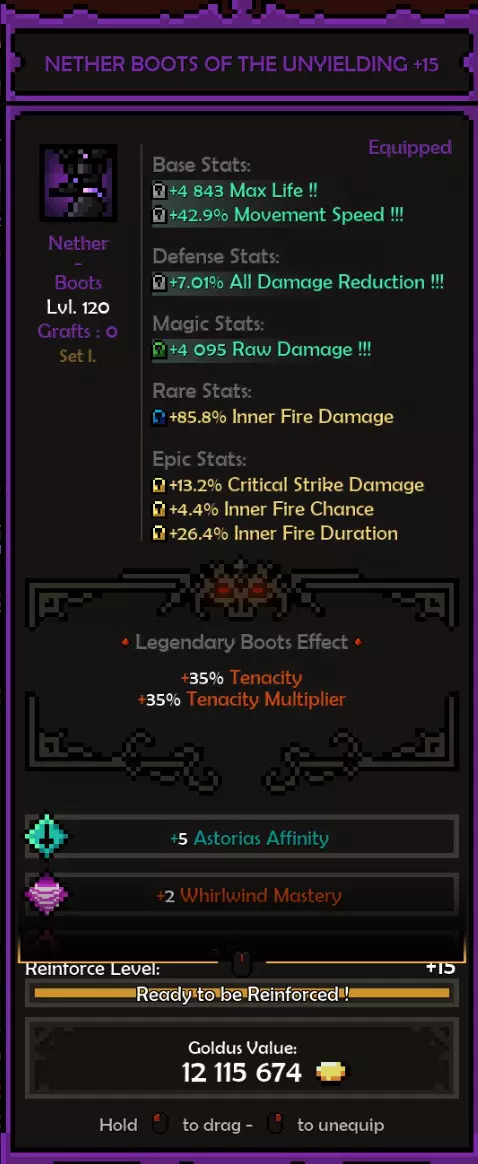 死神亲和:阿斯托利亚斯 精通属性:旋风 属性:残暴或勇气 推荐属性 基础属性: 最大生命值(数值)而非百分比,除非百分比提供的数值高于固定值。 原始伤害 先祖暴击率 暴击伤害 防御属性: 全伤害减免 理想情况下,你拥有全套暗影装备,并在防御属性上全部嫁接伤害减免。 这样做,你可以将全伤害减免最大化(75%)。 要做到这一点,你需要前往原始暗影界,找到一个带有全伤害减免纯属性加成的关卡并反复刷取。重要的是不要完成该关卡,直接离开,这样你就可以不断重复该关卡来获取装备。我还建议将筛选器设置为“仅显示带有纯属性、最高属性评分且已高亮的装备”。你可以通过点击角色面板上的属性来高亮显示该属性。 你可以将闪避率作为过渡属性,但闪避率存在严重的收益递减问题。我认为不可能达到100%闪避率,而且你无法躲避范围攻击,所以它并不值得投入。我确实在头盔上附加了最大闪避率,因为一定的闪避率还是不错的,但不值得专门去堆。 魔法/稀有装备: 你可以选择任何你想要的属性。 获取1条生命和法力吸取属性。 最大生命值 先祖打击几率 内心之火伤害/持续时间 暴击伤害 内心之火触发几率(尽量达到至少35%) 1或2条移动速度属性会很不错 史诗属性: 内心之火最大充能层数(优先选择,因为最大充能层数等于来自死神 bonus的持续时间)。而持续时间等于伤害,这得益于我们披风的传奇效果。内心之火伤害 内心之火持续时间 原始伤害 暴击伤害 1或2个坚韧属性 装备搭配建议: 每件装备都应在防御属性上达到最大全伤害减免 之后再进行其他选择。我的部分装备嫁接了传奇效果 根据需求选择属性。建议优先考虑最大生命值(固定值)、先祖打击几率、原始伤害、暴击伤害。在伤害和生存能力之间找到平衡 补充一点,我的最终选择是法力回复。你也可以选择区域伤害减免或其他任何属性 我的做法是,先确定想要优先提升的属性或该类别中最佳的属性,例如基础属性中,我优先选择最大生命值和原始伤害而非暴击伤害等。然后可以通过嫁接系统决定要替换或提升哪些属性 我的所有属性