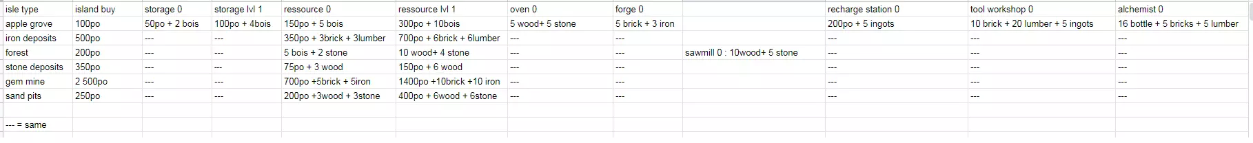 一份实用指南,涵盖了物品栏中各项物品的信息,包括售价、类别、对村民需求的影响、制作配方等内容。配件 物品 制作配方 所需工作台 买卖价格 影响村民需求 村民需求单位 存储位置 葫芦水瓶 20水 1葫芦瓶 木工台 70 饮品 100 储水处 草披风 40稻草 裁缝工作台 240 保暖 100 普通储物处 弹药 物品 制作配方 所需工作台 买卖价格 影响村民需求 村民需求单位 存储位置 简易箭矢 1木棍 1石头 1羽毛 猎人工作台 4 安全 1 军械库 消耗品 物品 制作配方 所需工作台 买卖价格 影响村庄需求 单位 存储位置 煮蛋 1蛋 1石头 营火 凹陷壁炉 烹饪锅 10 膳食 8 食物储存处 煮鱼 1生鱼 1木棍 营火 凹陷壁炉 烹饪锅 16 膳食 30 食物储存处 煮牛蒡 1牛蒡 营火 凹陷壁炉 烹饪锅 4 膳食 8 食物锻造6 安全8 军械库 服装 物品制作 配方 所需工作台 买卖价格 村民需求影响 村民需求单位 存储位置 足轻服装 20稻草 5铁矿石 5皮革 裁缝工作台 180 安全 50 普通仓库 强盗服装 25稻草 5毛皮 裁缝工作台 80 安全 10 普通仓库 精英服装 35稻草 5毛皮 2皮革 裁缝工作台 220 安全 60 普通仓库 僧侣服装 20稻草 5皮革 2珍珠 裁缝工作台 140 精神 40 普通仓库 农民服装 22稻草 4毛皮 裁缝工作台 110 奢华 15 普通仓库 难民服装 20稻草 裁缝工作台 50 奢华 1 普通仓库 村民服装 25稻草 5毛皮 裁缝工作台 150 奢华 25 普通仓库 武僧服装 25稻草 4毛皮 3铁矿石 裁缝工作台 200 精神 60 普通仓库 资源 物品制作配方 工作站需求 买卖价格 村民需求影响 村民需求单位 存储位置 黏土 无 无 2 维护 5 通用储物箱 优质针叶木板 1个优质针叶木原木 木工站 6 维护 5 木材储物箱 优质阔叶木板 1个优质阔叶木原木 木工站 6 维护 5 木材储物箱 阔叶木板 1个阔叶木原木 木工站 4 维护 4 木材储物箱 针叶木板 1个针叶木原木 木工站 4 维护 4 木材储物箱 石头 无 无 2 维护 2 通用储物箱 竹子 无 无 2 取暖 3 木材储物箱 树皮 1个任意原木 木工站 2 维护 1 木材储物箱 木炭 1个木柴 炭窑 2 取暖 5 木材储物箱 去皮针叶木原木 1个针叶木原木 木工站 2 取暖 8 木材储物箱 去皮阔叶木原木 1个阔叶木原木 木工站 2 取暖 8 木材物品 制作配方 所需工作站 买卖价格 村民需求 原木(去皮优质针叶木) 1根原木(优质针叶木) 木工站 4 取暖 10 木材仓库 原木(去皮优质阔叶木) 1根原木(优质阔叶木) 木工站 4 取暖 12 木材仓库 羽毛 无 无 2 无 无 普通仓库 毛皮 无 无 6 取暖 10 普通仓库 草 无 无 2 无 无 普通仓库 铁矿石 无 无 8 无 无 普通仓库 原木(针叶木) 无 无 4 取暖 10 木材仓库 原木(阔叶木) 无 无 4 取暖 12 木材仓库 原木(优质针叶木) 无 无 4 取暖 12 木材仓库 原木(阔叶木) 无 无 6 取暖 14 木材仓库 腐烂物 1个过期时间为负的消耗品 无 0 无 无 普通仓库 木棍 1根任意原木 木工站 2 取暖 1 木材仓库 茶叶 无 无 2 饮品 2 食物仓库 水 无 无 2 饮品 8 水仓库受影响村民需求 所需工具及材料: 石锛:3根木棍、3块石头,制作方式:手工制作(木工桌),维护值:10,存放位置:通用储物箱 石斧:3根木棍、3块石头,制作方式:手工制作(木工桌),维护值:10,存放位置:通用储物箱 木锤:1根任意原木,制作方式:手工制作(木工桌),维护值:10,存放位置:通用储物箱 石刀:3根木棍、3块石头,制作方式:手工制作(木工桌),安全值:5,存放位置:通用储物箱 石镐:3根木棍、3块石头,制作方式:手工制作(木工桌),维护值:10,存放位置:通用储物箱 铁锛:3块铁矿石、1块任意木板、3捆稻草,制作方式:铁匠砧,维护值:25,存放位置:通用储物箱 铁斧:3块铁矿石、1块任意木板、3捆稻草,制作方式:铁匠砧,维护值:25,存放位置:通用储物箱 铁锤:3块铁矿石、1块任意木板、3捆稻草,制作方式:铁匠砧,维护值:25,存放位置:通用储物箱 铁刀:2块铁矿石、2根木棍、1张皮革,制作方式:铁匠砧,安全值:15,存放位置:通用储物箱 铁镐:3块铁矿石 1 任意木板 3 稻草 铁匠砧 20 维护 25 通用储物箱 钢锛 1 钢 1 任意木板 1 皮革 铁匠砧 100 维护 45 通用储物箱 钢斧 1 钢 1 任意木板 1 皮革 铁匠砧 100 维护 45 通用储物箱 钢锤 1 钢 1 任意木板 1 皮革 铁匠砧 100 维护 45 通用储物箱 钢刀 1 钢 2 木棍 1 皮革 铁匠砧 100 安全 35 通用储物箱 钢镐 1 钢 1 任意木板 1 皮革 铁匠砧 100 维护 45 通用储物箱 杰作锛 2 钢 1 任意木板 2 皮革 铁匠砧 200 维护 75 通用储物箱 杰作斧 2 钢 1 任意木板 2 皮革 铁匠砧 200 维护 75 通用储物箱 杰作锤 2 钢 1 任意木板 2 皮革 铁匠砧 200 维护 75 通用储物箱 杰作刀 2贵重物品 制作配方 工作站 钢1 任意木板2 皮革 铁匠砧 200 安全性 待定 通用储物箱 杰作镐 钢2 任意木板1 皮革 铁匠砧 200 维护 75 通用储物箱 桶 任意木板2 木工台 2 维护 10 通用储物箱 凿子 铁矿石1 木棍2 皮革 铁匠砧 10 无 无 通用储物箱 烹饪锅 铁矿石6 铁匠砧 90 无 无 通用储物箱 锻造锤 钢2 任意木板1 铁匠砧 150 维护 65 通用储物箱 锄头 铁矿石1 任意木板2 铁匠砧 待定 待定 待定 通用储物箱 镰刀 铁矿石1 任意木板1 皮革 铁匠砧 110 安全性 30 通用储物箱 铲子 铁矿石1 任意木板2 稻草5 铁匠砧 40 维护 35 通用储物箱 搅拌工具 任意木板1 木棍1 木工台 70 无 无 通用储物箱所需购买/出售价格 村民需求影响 村民需求 单位 存储位置 N/A N/A 2000 N/A N/A 警钟 珍珠 N/A N/A 50 奢侈品 35 通用仓库 小型御币 1根木棍 木工台 30 精神需求 5 通用仓库 雕像(天照、惠比寿、稻荷、