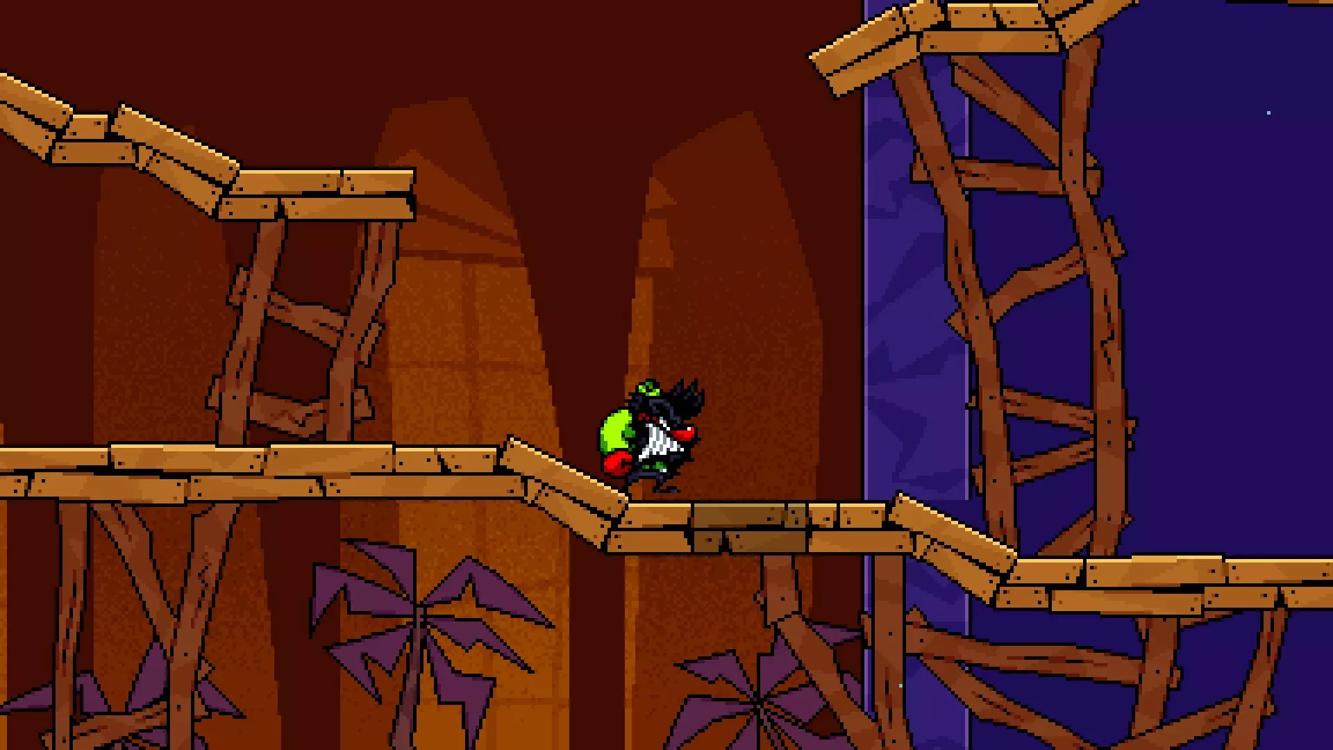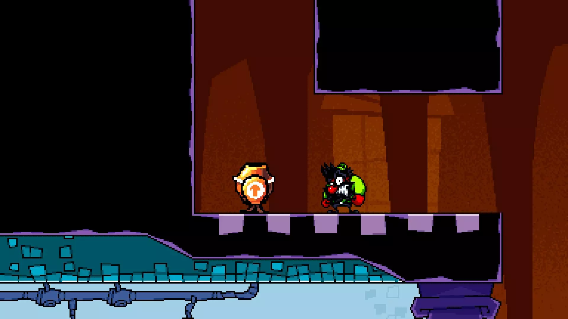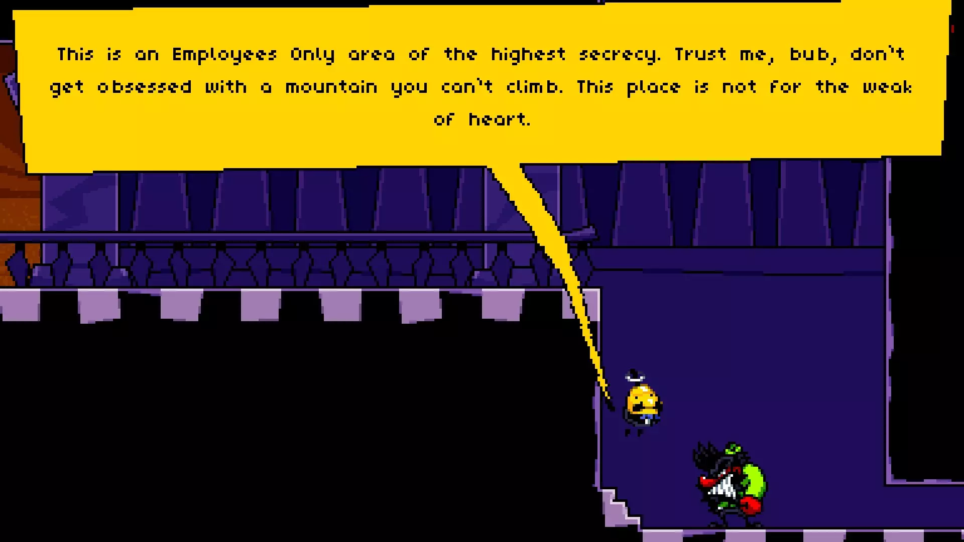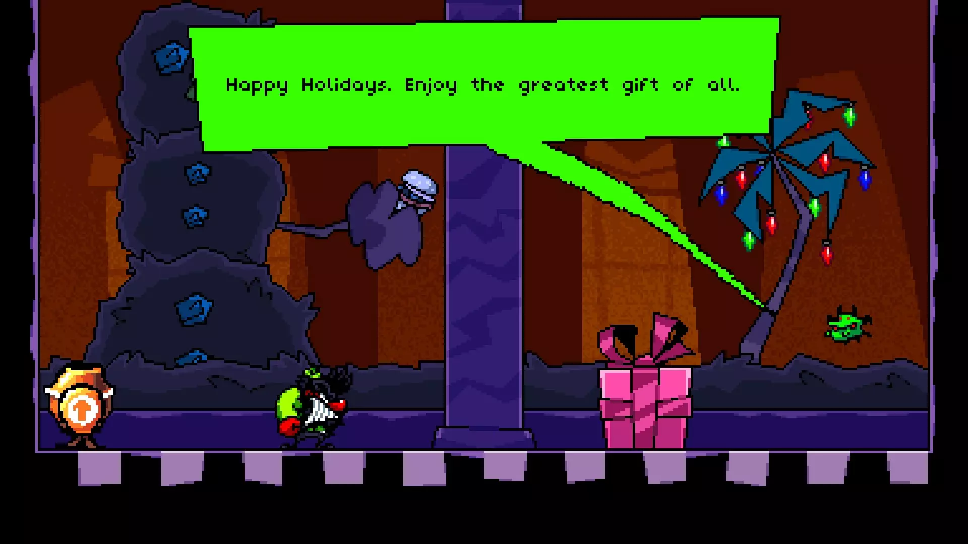 位于疯狂巨龙之战入口附近,可通过从最高的木制平台使用原子炸弹(Antomic Bomb)跳到下方楼层进入。里面有一个房间,里面有一个绿色的微型恶魔,它说“节日快乐。享受最棒的礼物吧。”,那份礼物是一个红绿相间的巅峰人(Peakman)。 顶层 名称 图片 描述 水族馆