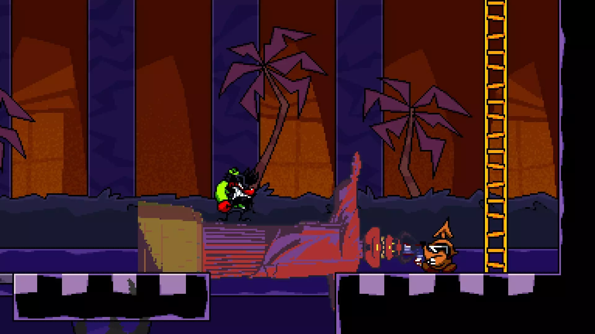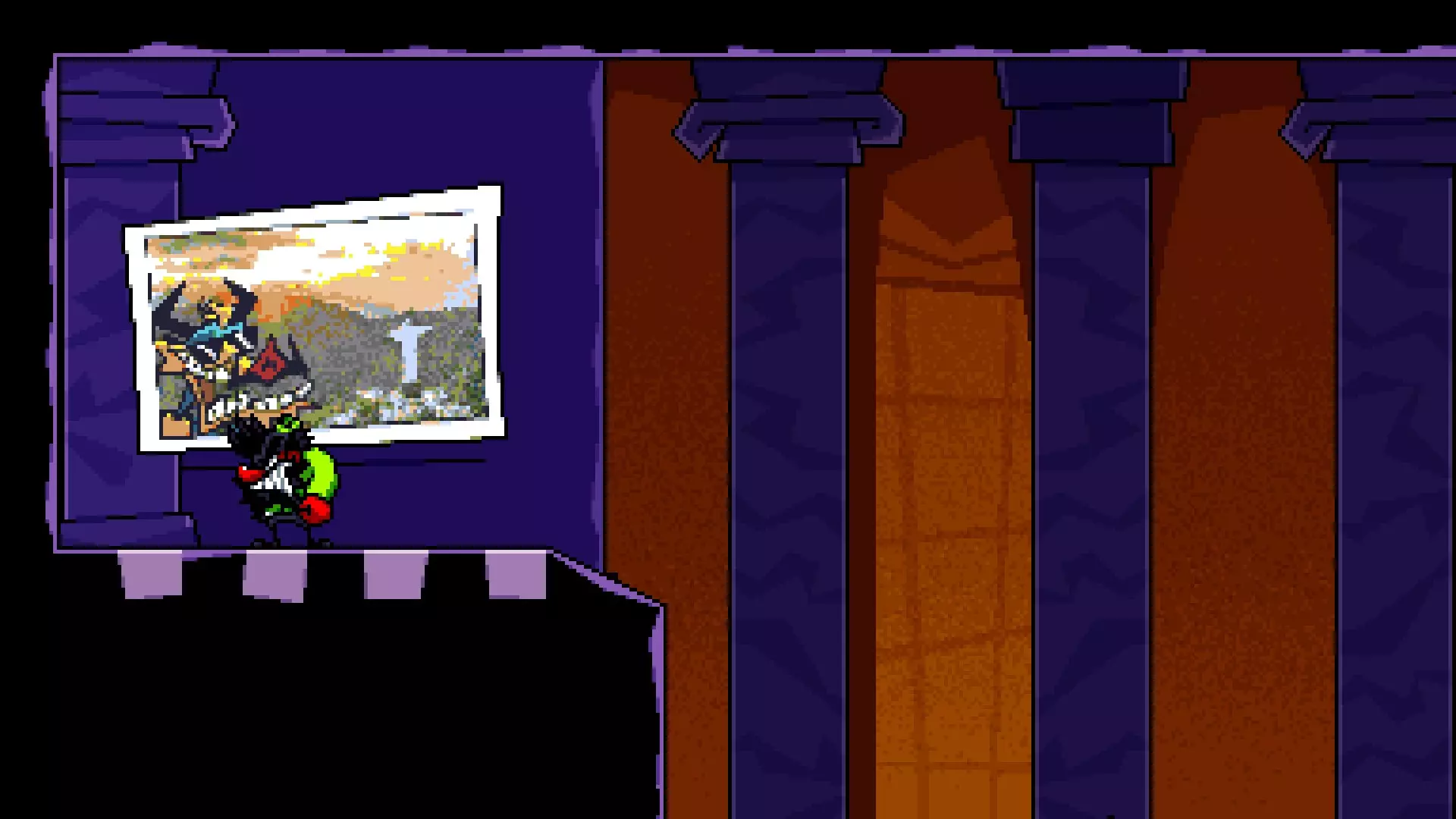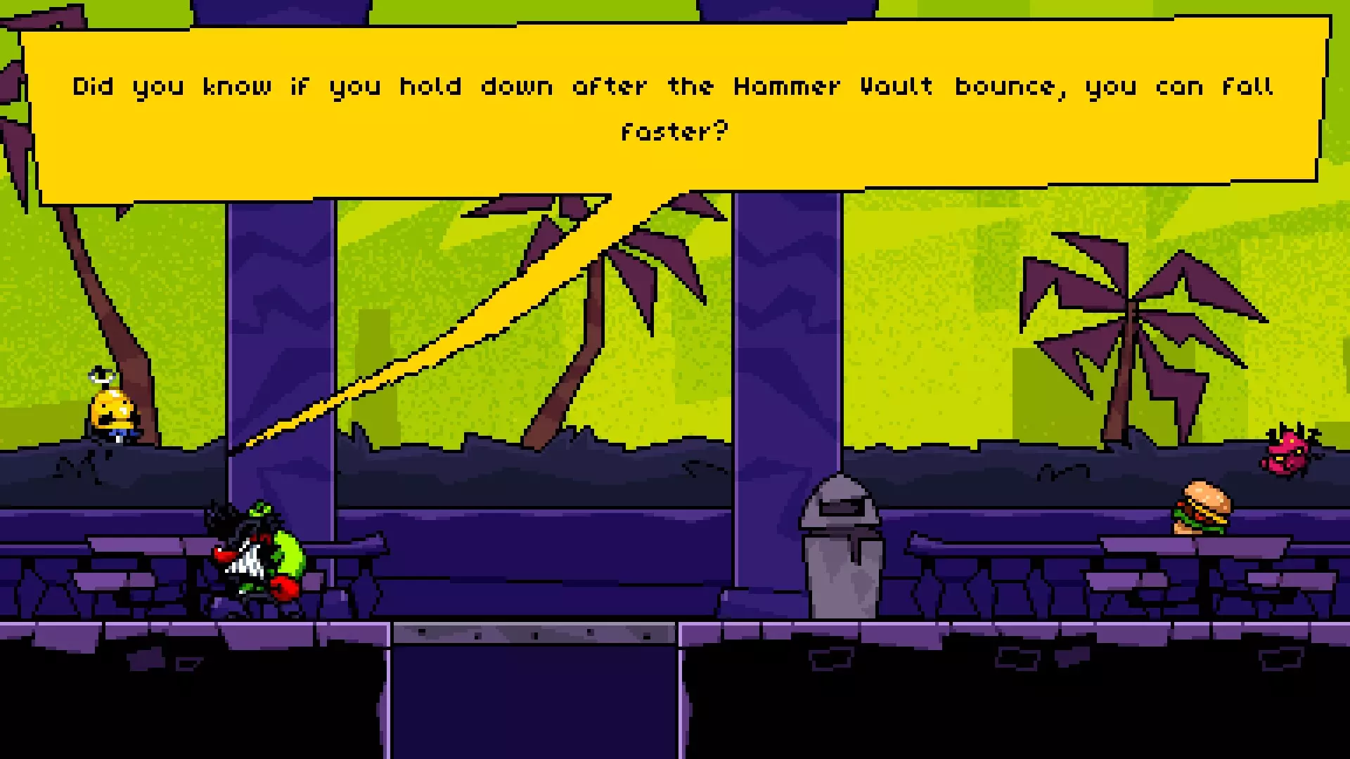 在【混凝土丛林】入口左侧的墙壁内。这是较难到达的房间之一,需要使用冲刺加速,然后在靠近墙壁处使用原子炸弹技能以获得足够高度进入房间。 房间内有: 一个布鲁洛小恶魔,它会说“你知道吗?在锤子 vault 弹跳后按住下键,可以更快下落”“欢迎来到屋顶”“你知道吗?滑行时可以把炸弹石之类的东西扔得更高”或“你找到水族馆了吗?” 一个靠近汉堡的小恶魔,它会说“汉堡”或“yum yum yum!” 一个小恶魔说“你见过格雷格和玛蒂尔达吗?我讨厌他们。” 角落里的一个小恶魔说“我们都有愚蠢的‘人类名字’来取笑地面上的人。”“我本来想叫布里奇特、黛利拉,或者……朱莉娅来着。但我没及时填好表单,所以他们就随便给我分配了一个,现在我叫……呃……蒂娜。”——假日房间