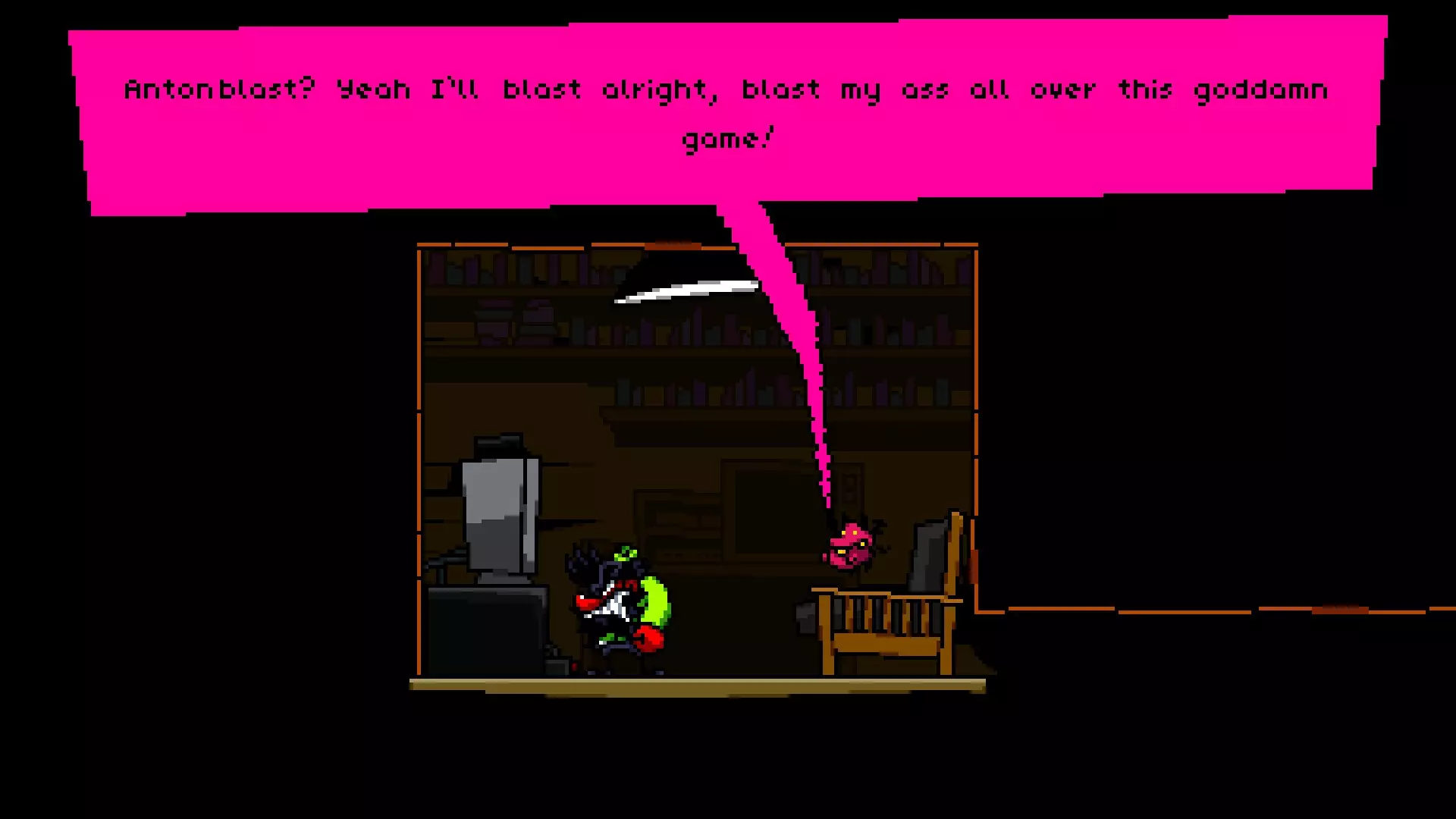 位于弹珠泥潭入口的左下角,泥坑上方。 获取方法分两步: 1. 利用从入口大厅通往西翼的斜坡。 2. 跳过两个缺口,进入房间。 房间内有一个微型恶魔,坐在重现《愤怒的游戏宅》中“宅”的房间场景里。进入房间时,他会说出以下四句话中的一句: “啊——屁股!” “哇,小心微型安迪!你太快了!” “《安东冲击波》?是啊,我当然会‘冲击’,把我的屁股‘冲击’到这破游戏的每一个角落!” “他们到底在想什么?”