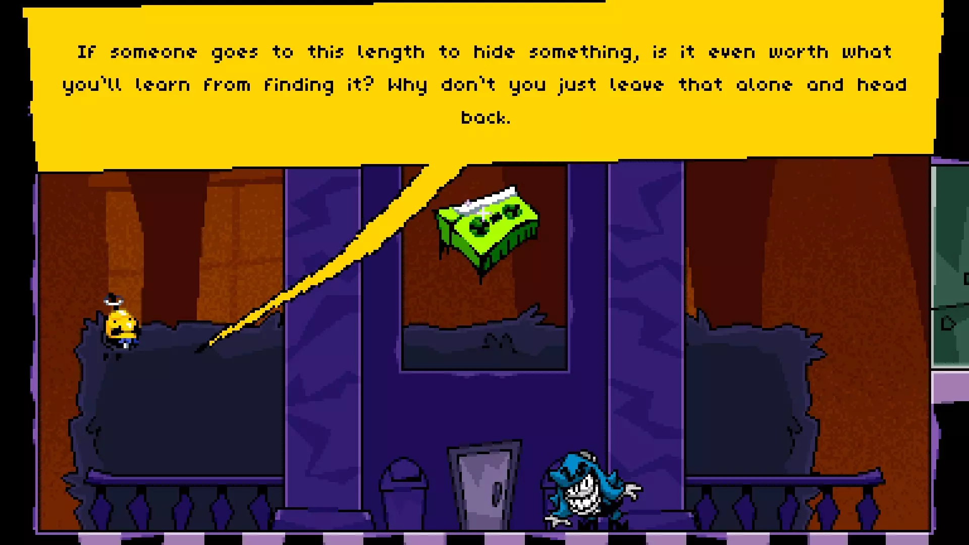 位于左下角靠近【格斗破坏者战场】入口处,可通过斜坡到达,靠近【炸弹糖果矿场】入口。 进入后,你会立即打碎浴缸,一个微型恶魔会说:“你毁了我的澡!这要花一千七百亿亿兆美元,小子。” 再次进入东翼时,浴缸仍然会消失,他会有一个空白的对话框。 目前,带有绿色油漆的空门框没有任何作用,可能会在未来的更新中添加。一旦添加,本指南将相应编辑。 西翼 名称 图片 描述 愤怒的游戏玩家书呆子