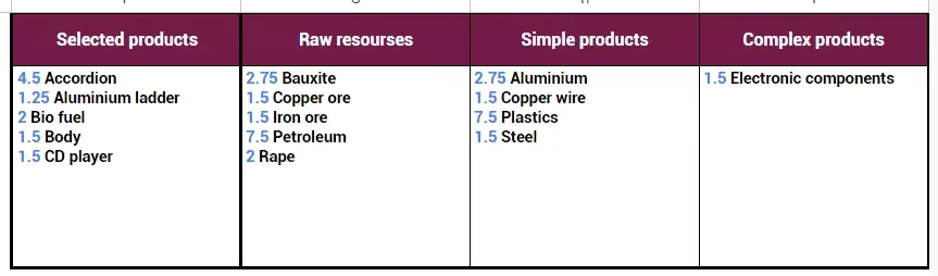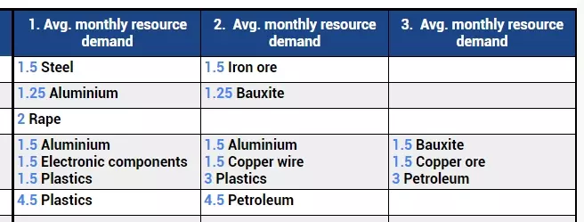 查看总需求:总需求表:位于右上角,该表格汇总了满足您已输入的所有产品平均需求所需的全部资源。它包含四列: 所选产品:显示计算表中所选产品的总需求量。 原材料:显示所需的基础材料。 简单产品:显示生产所需的中间产品。 复杂产品:列出生产链所需的更复杂组件或成品。