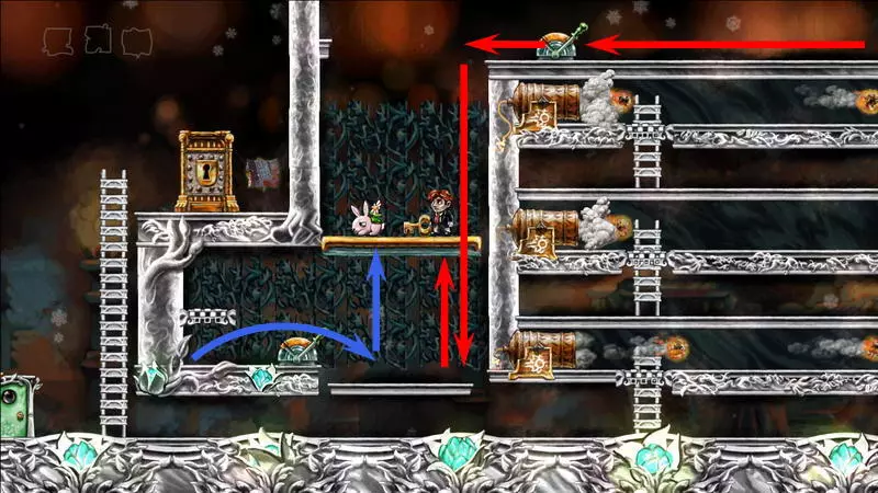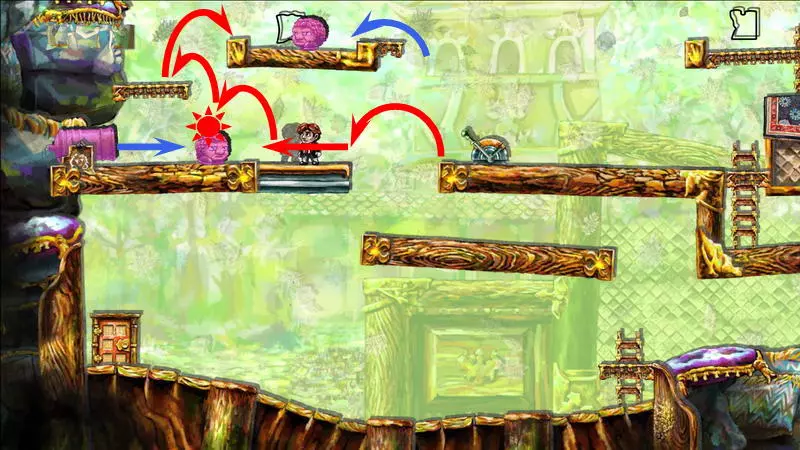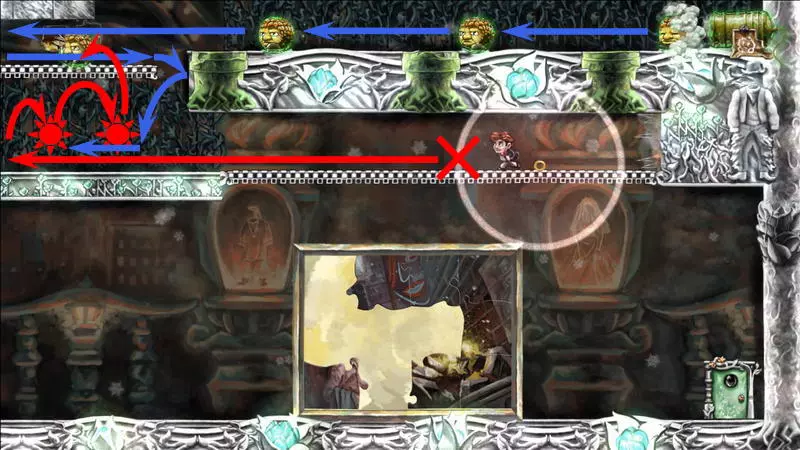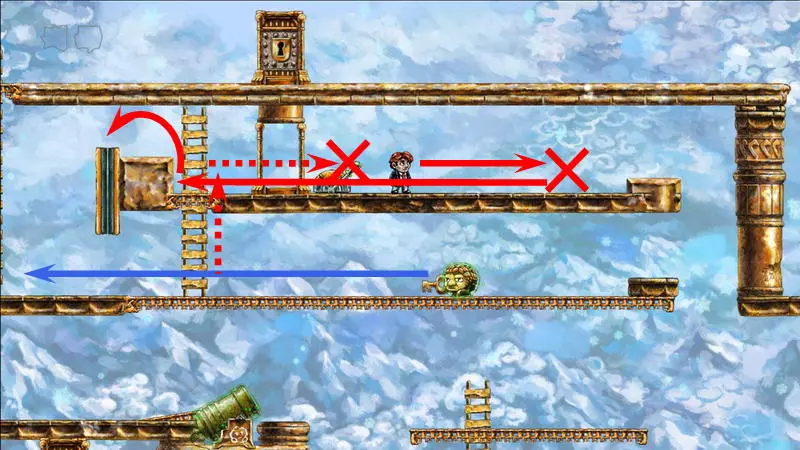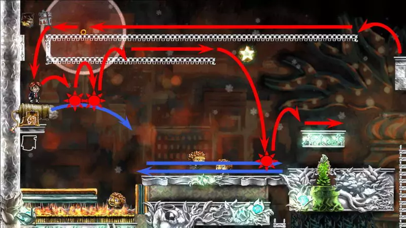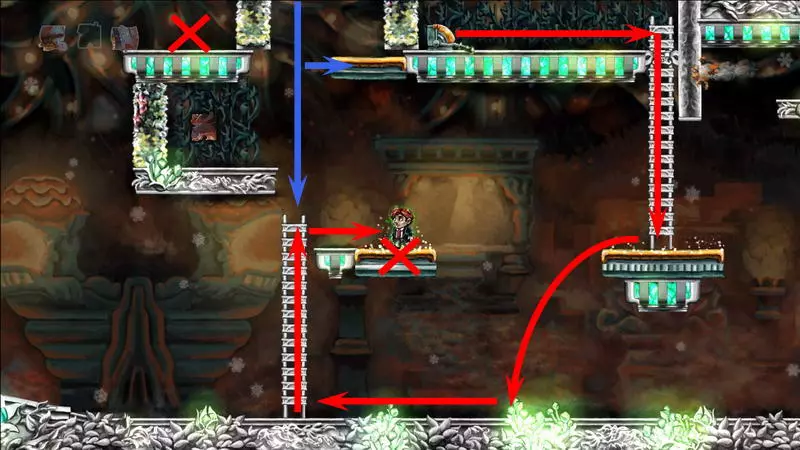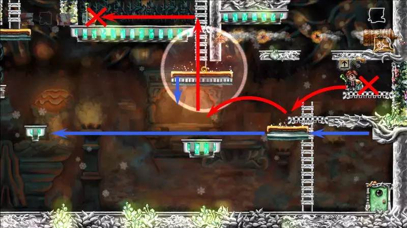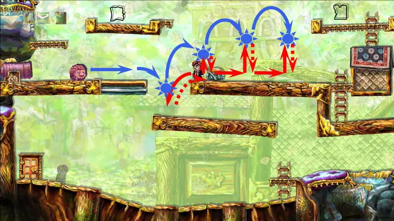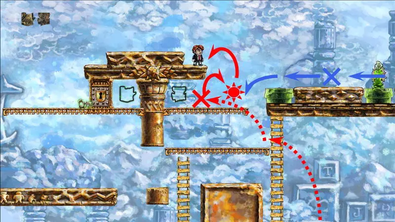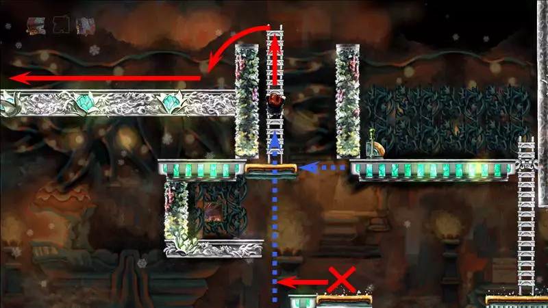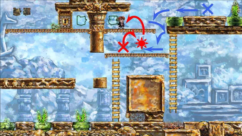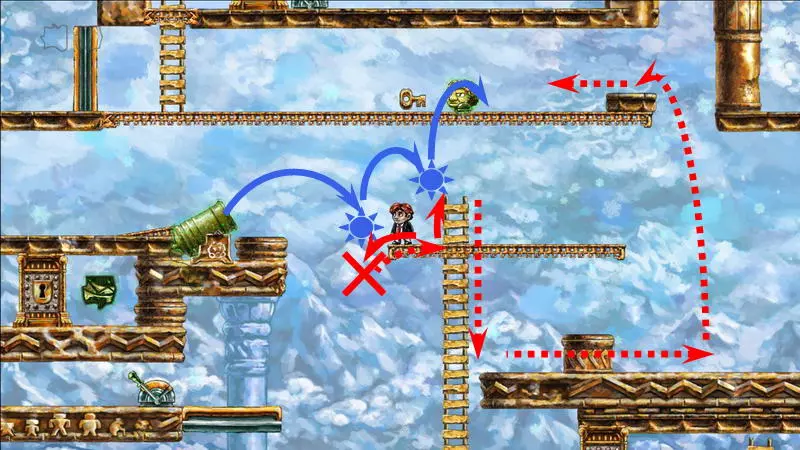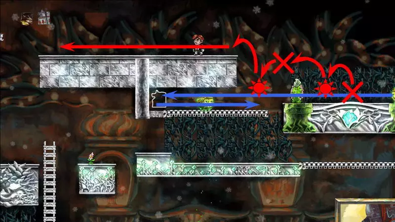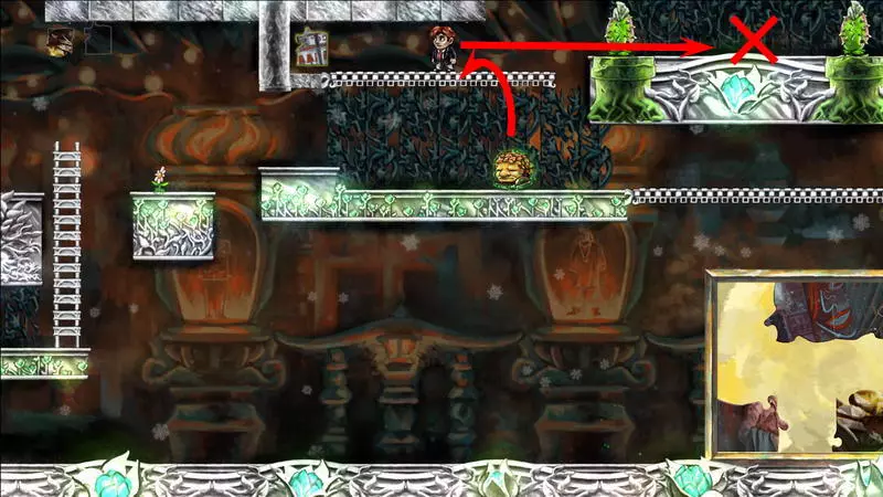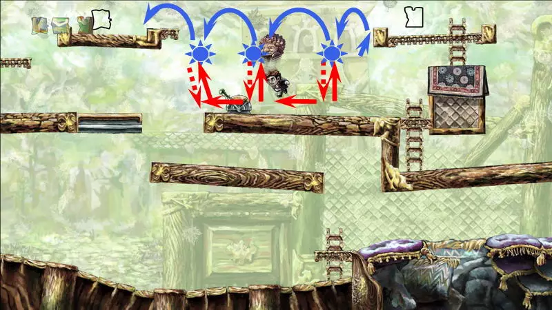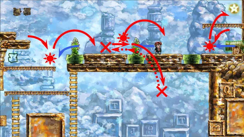 星星3 星星3 - (世界4.5 - 斜坡移动) 第三颗星星位于三株具有攻击性的植物后面(这可真是“披荆斩棘寻星星”)。 在这个世界中,时间流动与主角的移动相关联,当主角靠近时,这些讨厌的荆棘就会从花盆中出现,这一点无法改变。需要借助敌人进行反弹来跳过这些植物。首先需要登上有植物的上层平台。只有从右上角发射器中跳出的小型红棕色怪物能提供帮助:它们不受时间流动的影响。需要调整整体时间,让植物能及时从怪物的路径上移开。为此要创建特殊的时间模式。通过图片能更容易理解:需要站在起始点,让最左边的植物完全隐藏;5-6秒后需要快速跑到中间点并站定,让中间的植物完全隐藏;在该点再停留5-6秒后,就可以继续向右移动,直到最右边的植物完全隐藏。现在需要走回头路:先等待怪物经过第一株植物,然后迅速将时间回溯到中间点(注意不要过度回溯,以免错过这个时间点),接着等待怪物经过第二株植物的位置,再快速回溯到起始点。这样一来,怪物就穿过了荆棘,接下来只需等待它下来,然后踩着它跳到上方的平台。这个技巧成功了吗?现在是时候再试一次了。首先,最好在上方平台多站一会儿,这样之后就不会不小心错过这个地方。接下来,你需要精确地重复时间回溯操作,让另一只怪物穿过植物。不过这次,你要站在上方平台等着它,这样就能跳过第一株植物了。要通过第二株植物,需要径直走向它并死亡……死亡后,蒂姆会向右下方坠落。当右侧的植物完全隐藏时,需要停止时间(将回放速度设为x0,方法是按住“Shift”键和“上”方向键)。当怪物经过植物的第一帧后,可以将时间回退,从而复活主角,并站到能隐藏中间那株植物的位置。等待怪物出现,跳到它身上,然后越过第二株植物。 第三株植物应该没什么问题,靠近时它会部分隐藏起来。只需爬上炮台,跳到敌人身上,然后垂直向上弹起。上方平台上会有一颗星星。 1) 引开第一个怪物。