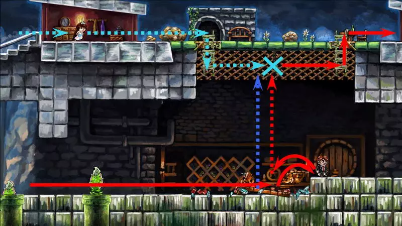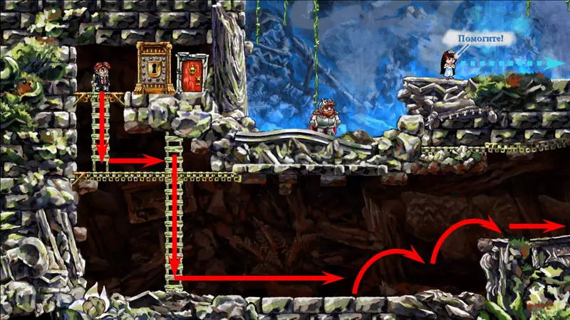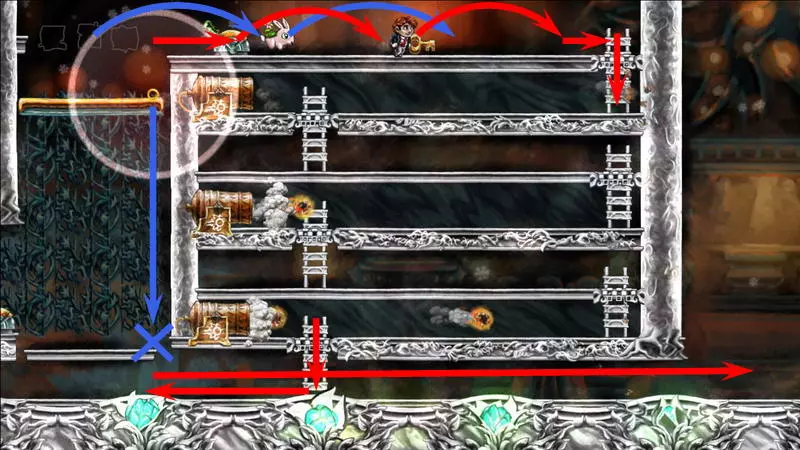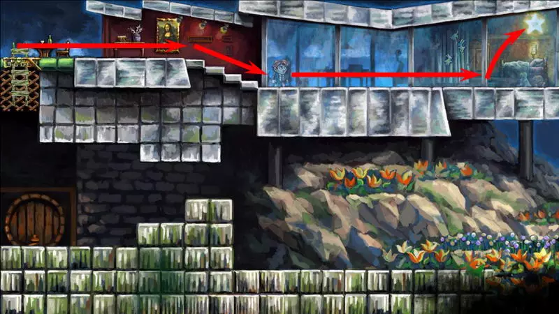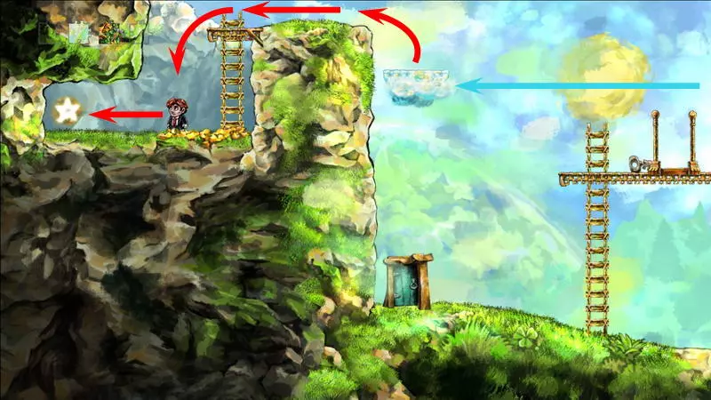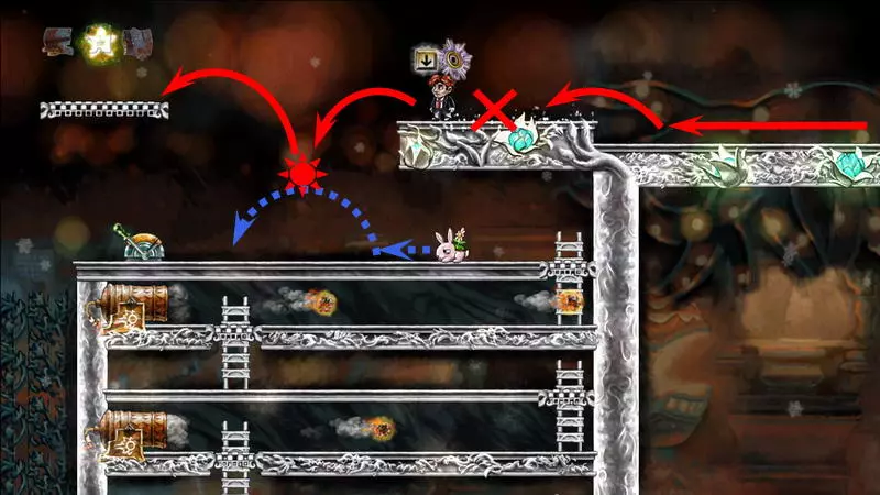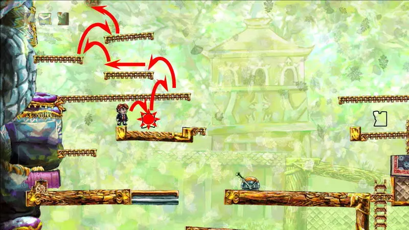 第8颗星星 第8颗星星 - (世界1.1 - 时空幻境) 只有收集到其他所有星星后,才能收集第8颗星星。借助星星的力量,关卡中的两个杠杆将不受时间影响,这样就能追上公主。 大炮后面有第一个杠杆,它发出绿色的光。按下它,将时间至少回溯五秒,然后再次向前走,不用理会这个杠杆。这次大门提前敞开了,公主得以比常规情况更早地逃脱。第二个这样的拉杆位于怪物出现的地方。我们按同样的方式操作:按下拉杆,倒回时间,再向前走。 按下两个拉杆会加快通过障碍的速度。现在,英雄会比公主提前几秒钟到达房子,甚至在她碰掉吊灯之前。要等待吊灯落下,需站在它右侧的台阶上。当吊灯掉落时,要跳到它的残骸上方并开始倒转时间。这盏吊灯并不普通,倒转时间时,站在上面的主角不会回到过去,而吊灯本身会回到顶部。当你与公主汇合时,会出现一道耀眼的闪光。此时需要及时跳起并抓住格栅。你现在在顶层,现在可以向上走并继续向右进入公主的房间。在她的床正上方挂着最后一颗星星。 1) 开始拯救公主。