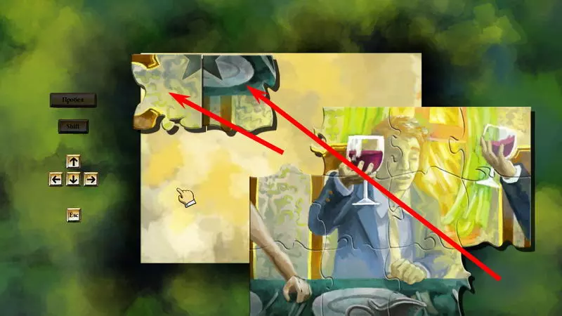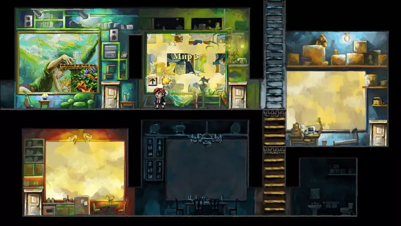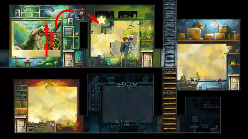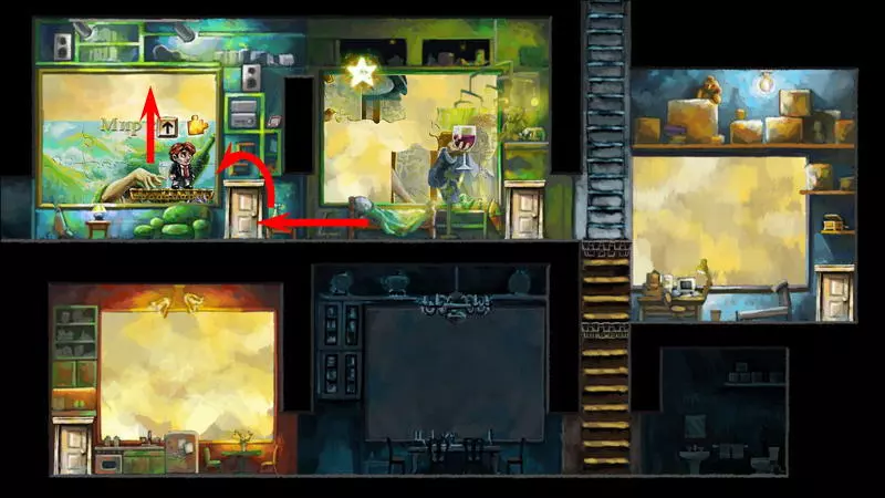 星星2号 星星2号 - (蒂姆的家) 注意:不要完成第二个房间的拼图! 要获得第二颗星星,需要来自第二个房间(世界3)的两块拼图碎片。下图展示了如何以及在哪里放置这两块碎片,以拼出星星的下半部分。星星的上半部分位于房子的墙上。当拼图碎片摆放正确时,星星就会点亮(通常第一次尝试无法成功,需要不断进入画面,将碎片一点点移动,再退出画面检查结果)。 现在可以收集星星了,只需到达星星所在位置即可。要想爬到更高处,需要使用第一个房间里的那幅画,画上描绘着真实的平台。首先进入第一幅图画的界面,松开图画,使平台位于图画的下边缘。之后,从图画界面返回,跳上平台。接下来:向上跳跃,在跳跃过程中进入图画,稍微抬高平台,再退出图画并落在抬高后的平台上。需要重复此操作几次。爬到足够高的位置后,只需跳到房间之间的黑色方形平台上,再从那里跳向星星。 1) 第二个谜题必须解开。
