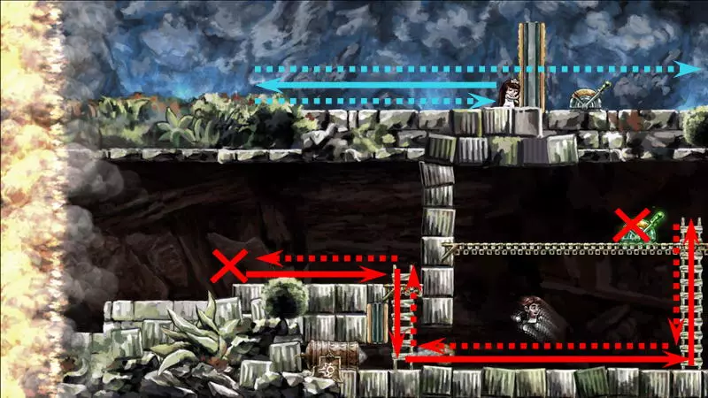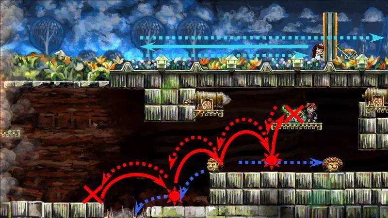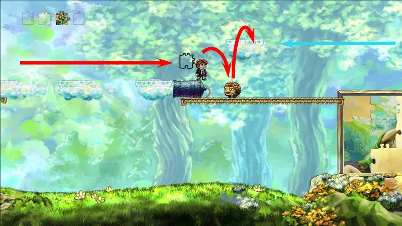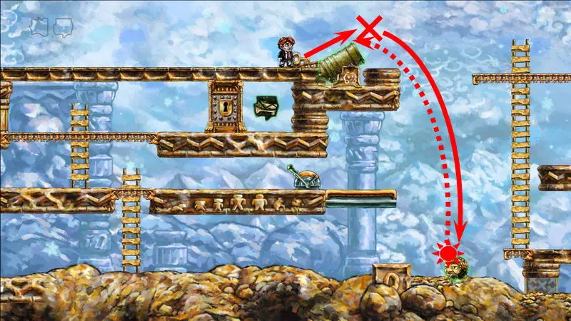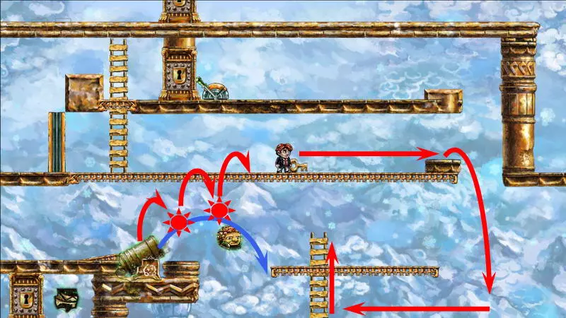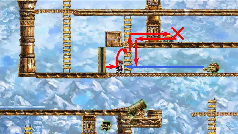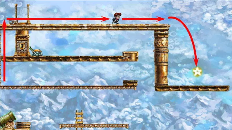 星星4 星星4 -(世界4.7 - 善变的伙伴) 这依然是第四个世界,这里的时间流动同样与主角的移动绑定。但现在的任务是将钥匙送到对应的门前。这把钥匙十分普通,因此当主角向左移动(时间将倒流)时,钥匙会回到过去。这就是全部问题所在。解决当前困境的唯一办法是依靠一只不受常规时间影响的小怪物:你需要把钥匙交给它,让它把钥匙正常带到左边。 首先,你得带着钥匙走到关卡中唯一的加农炮旁,在炮边站几秒,然后向下走并踩死那只小怪物。紧接着,立刻回溯时间,让主角重新站到加农炮旁边。现在需要及时跳到从炮筒里弹出的怪物身上。由于时间对怪物无效,所以只能倒放主角的动作。可以提前起跳,在合适的位置暂停时间,等待怪物弹出并将主角稍微向上顶起。与怪物接触时,自然需要关闭时间控制,以便借助下方的撞击向上飞起(此时不能向左转身)。之后需要再次在空中怪物飞行的路径上停留,但这次要在更高的位置。第二次被推动后,主角会跳上位于屏幕外更高处的平台。 你已经在平台上了,现在需要让怪物也来到这里。在平台上需要站立一段时间,以便之后能回溯到这个时刻。之后:向下跳跃,消灭下方的怪物,然后站在大炮对面的平台上等待新怪物出现。一旦怪物开始从大炮中飞出,需要“稍微下落”(即从平台左侧的缺口迈步下去,一秒后暂停时间)。正确的操作应该是这样:怪物会直接跳到你头上,然后因此向上弹起一点,这时你需要让角色回到平台上并向上跳,让怪物再次跳到你头上。经过这些操作后,怪物会出现在上方平台并拿走那里的钥匙,而你只需将时间回溯到自己站在这个平台上的那一刻即可。试炼还未结束,真正有趣的部分才刚开始。当你带着钥匙向左移动时,钥匙会回到过去并从你手中掉落;而在不受常规时间影响的怪物手中,钥匙的状态会更稳定。你必须与怪物合作:你带着钥匙向右走,它则向左走。首先,你需要小心对待你的助手,因为如果不小心杀死怪物,就必须从头开始——把它扔到平台上。因此,获取怪物身上的钥匙需要这样做:站在它的左侧,等待它走向角色,在即将碰撞的最后一刻,钥匙会自动落入角色手中,然后需要迅速向右跳过怪物,期间千万不要向左回头。第一次需要从楼梯左侧跳下,然后用钥匙爬到更高处并打开大门。站在拉杆旁时,需要向下走,把钥匙交给怪物(可以直接站在楼梯旁等怪物把你压扁,当它带着钥匙离开后,让角色复活),将时间回溯到拉杆处,按下拉杆,再向右走远一些,等待怪物通过从下方打开的大门。进入怪物带着钥匙进入的左侧独立房间。需要再次从它那里夺取钥匙,插在楼梯左侧。之后就没有任何难度了:拿着钥匙上楼梯,打开最上方的大门,然后向右跑到星星处。 1) 杀死怪物,等待新的怪物出现。
