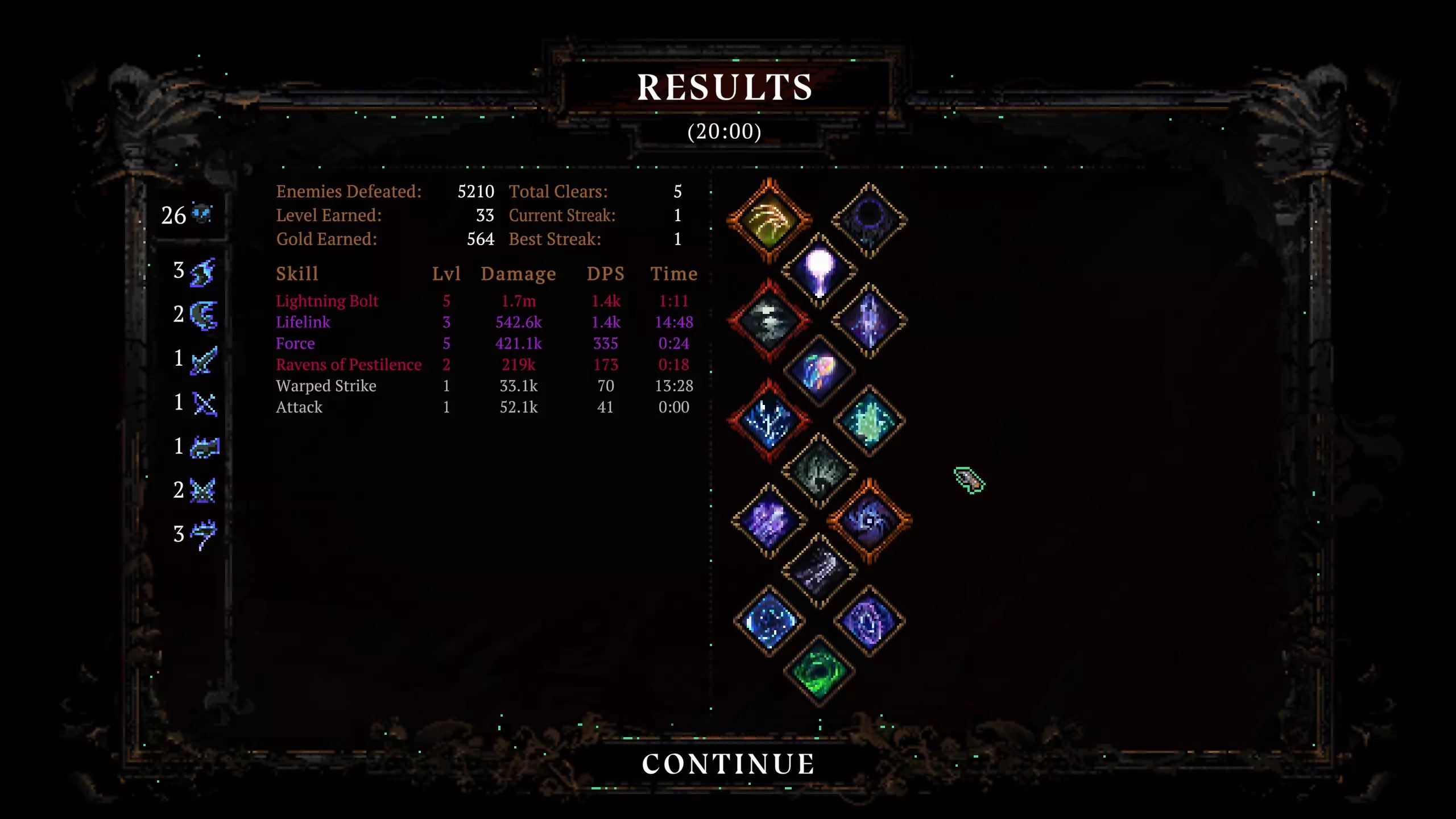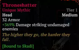 角色:任意,我使用斯卡蒂和克朗特,可搭配召唤或其他流派。 印记: 斯卡蒂:学徒印记 克朗特:海啸印记或流星印记(不穿护甲,风险极高) 装备: 此流派需要【瞬击】装备 - 暴击以进一步提升伤害 - 增加祈祷次数以提高获得优质祝福的几率 - 生命值高于50%时增伤或低于50%时增伤均有用,但非必需 核心: 致命一击+狂乱+灵魂窃取以提升伤害(避免任何造成低伤害的技能,以免触发瞬击失效,可使用的其他死神技能包括幸运、恶疾、吸血(使用克朗特时,也可能被秒杀)和处决)对于其他神明,推荐选择【时间】与【正义】以获取更高等级、更快速度并提升生存能力。你也可以使用【克罗姆】搭配传说装备来造成更高伤害,但难度较大。 策略: 提升伤害并消灭所有敌人,你唯一需要注意的是早期精英怪以及 Boss 的秒杀技能。 farming build 此流派用于神话装备 farming,适用于任何黑暗等级。理论上等级越高效果越好,但有时在 30 级会掉落灰色和蓝色物品,原因不明。使用此流派,你将在 run 中装满神话物品,并在过程中选择要丢弃的物品。 角色:任意,个人首选【梅里斯】 印记:【时空印记】 装备: 可选:增加神话装备掉落几率的物品