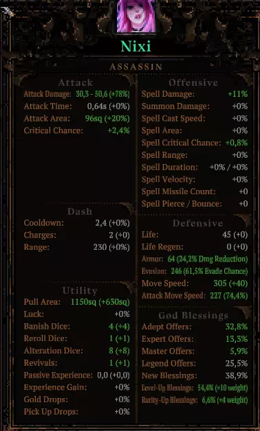 我发现闪避机制存在不一致的情况。我有75%的闪避率,却被连续多次攻击命中而死亡;而在50%闪避率时,却能闪避很多攻击。这是运气不好还是其他原因呢? 该角色的祝福与其他流派类似,但我们可以选择与其他流派相同的扭曲打击,或者选择致命一击,进一步提升混乱值,并完全依赖神圣护盾、报复和天国之翼来进行闪避。升级灵魂窃取者和运气属性以最大化 dps 和混乱值输出,随着时间推移提升宝石等级,其他技能也能提供帮助。对于这个角色来说,时间领域更好,暴击率和攻击速度也很有用,闪避精通的作用稍小但也可以选择,先发制人在这个流派中甚至更有效。趣味构筑 召唤流 角色: - 阿沃伦:信徒印记(堆叠熟练、大师和传说印记以轻松获取传说装备) - 梅里斯:召唤者印记(提升召唤物伤害) - 斯卡蒂:野兽印记(初始拥有一个不错的召唤物) 神明: - 时间:必选,召唤者祝福和宝石高加成是该构筑的核心 - 死亡:拥有唯一的非传说召唤物和混乱效果 - 正义:此构筑下自身较脆弱,易受快速敌人攻击,可选择防御相关能力 - 寒冬:提供一定防御和一个传说召唤物,搭配冰冻宝藏也可成为farm构筑Summer:提升更多攻击力并进行一次传奇召唤 装备: - 召唤黑曜石龙、火龙、冰龙的能力非常强大,开局拥有它们基本能保证胜利;骷髅召唤虽然可行,但强度要弱很多 - 【+】类道具很重要,尤其是当我们选择冰火流派时,要叠加大师级和传奇级道具的出现概率 - 召唤物伤害最好从一开始就逐步提升,但在游戏过程中也能获得大量此类伤害加成 - 法术伤害同样会提升召唤物伤害 - 【+经验值】能极大帮助获取传奇技能和高等级技能 策略: 扭曲攻击、宝石强化与召唤者的协同效应【com】将作为该流派的伤害叠加部分,扭曲打击能为你提供更多等级(你也可以使用智慧,但并非优先选择),高宝石等级会提升攻击速度和移动速度,但更重要的是它能减少【召唤者】的冷却时间,而【召唤者】能提供大量召唤物伤害(我认为这需要有召唤物在场)。 流派的其余部分为死亡系,以获得召唤物(乌鸦和骷髅,噬魂者作为召唤物的机制我不太清楚)。如果你装备中没有龙类召唤物,这些召唤物表现尚可。优先提升乌鸦的稀有度和等级,以便与狂乱搭配使用,狂乱在此流派中的作用虽不如其他流派,但仍有帮助,处决也能提供助力。 防御方面选择正义系,挑选你喜欢的技能即可。冰与火将提供伤害加成和其他技能,还有龙。值得一提的祝福包括: 冬季:冰霜之环(防御类,对远程角色作用较小)、白霜(与其他状态效果配合)、冰封宝藏(与 farming 流派搭配)。其他祝福也可能有用,但这些是主要的。夏季:【狂热】(提升法术伤害)、【烈焰】(非常出色的自动投射物)以及【焚化】+【燃烧】(对强化火龙十分有效) “一击秒杀”流派(瞬时打击):该流派围绕“瞬时打击”构建,这是一种装备词条,能提升首次攻击的伤害。使用此流派时,我在不暴击的情况下能造成约7000-10000点伤害,可一击消灭所有敌人,有时也能秒杀 bosses。我曾用它在整局游戏中实现一击秒杀,但上次使用时伤害不如以往,原因不明,可能是属性叠加不足,更新日志中也未提及相关改动。
