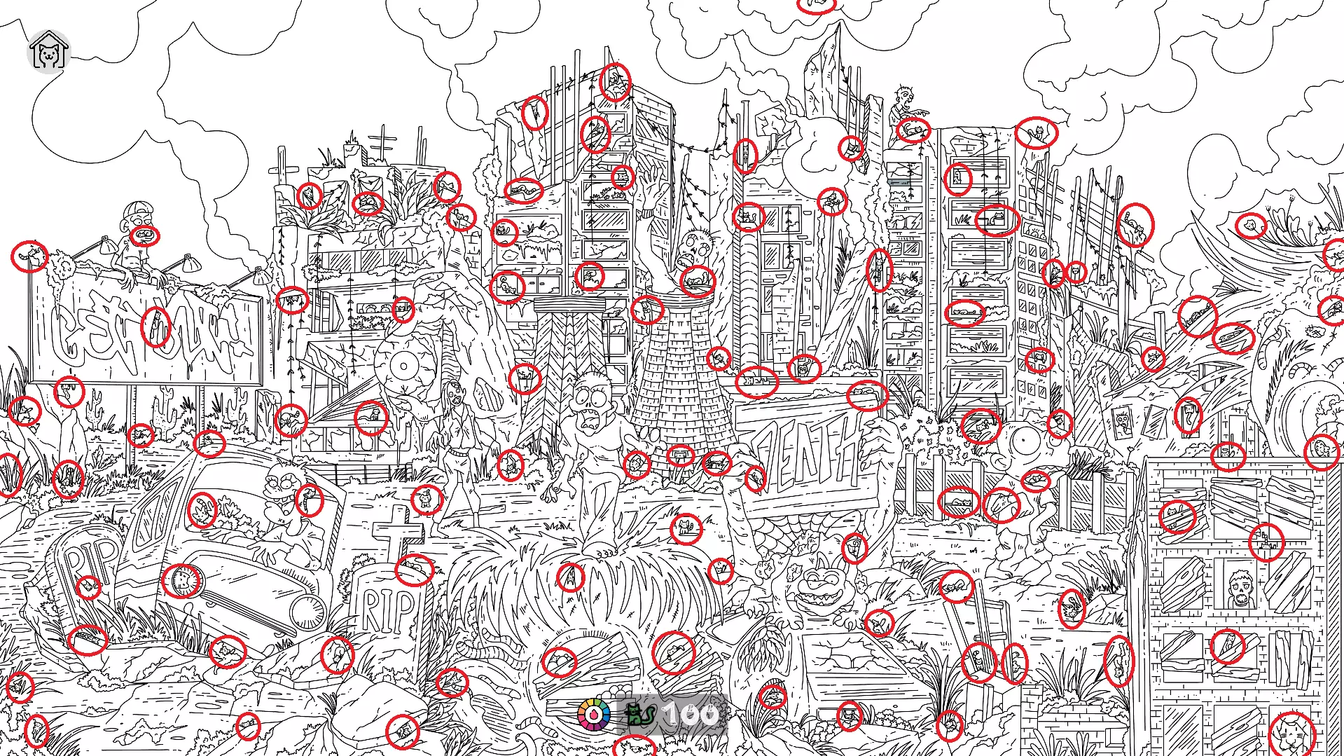 这是《Cats Hidden in Georgia》的100%完成及全成就解锁指南,按区域标注了图中所有猫咪的位置,最后一只猫咪已用红圈标出,能帮你顺利找到所有神秘猫咪,达成游戏全收集。