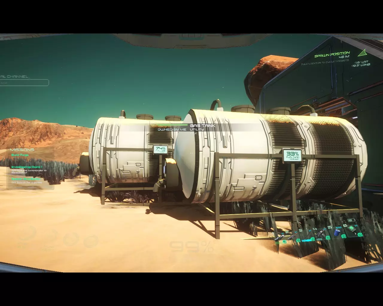 接下来使用桶收集氢气和氮气,你携带多少取决于你自己,但要记住你需要走多远。我会尽可能多带一些,这样可以省去整天跑来跑去的麻烦。之后当你有了飞船,你可以在货舱里装满桶,装入一半氢气和一半氮气,这样当你制作联氨时,只需装满一个液体罐,以备日后加油使用。当你有了氢气和氮气后,只需在化学台中将它们与玻璃容器混合,就能得到燃料。我有两个气体罐,一个装氢气,一个装氮气。
