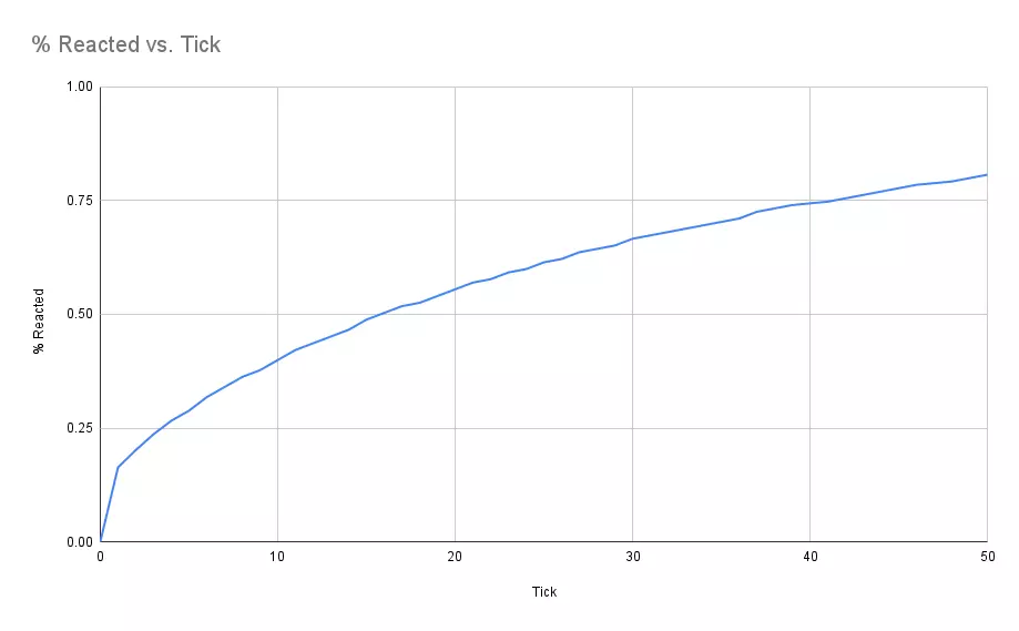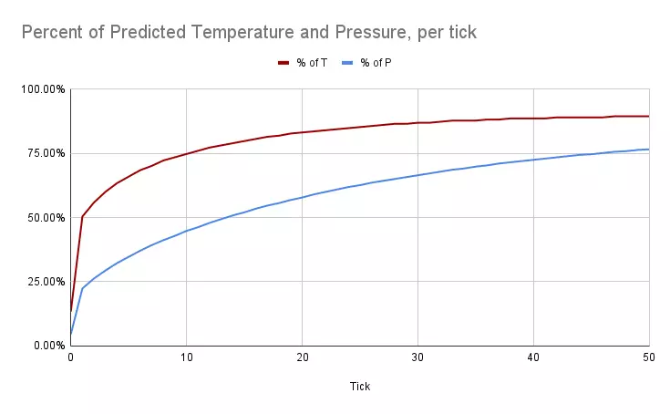 这是50个燃烧周期,即25秒,在此期间80%的燃料已燃烧。由于我们实际拥有的能量和摩尔数比计算结果少,因此压力也较低——在50个周期时,我观察到压力为计算值的77%,温度为计算值的89%。