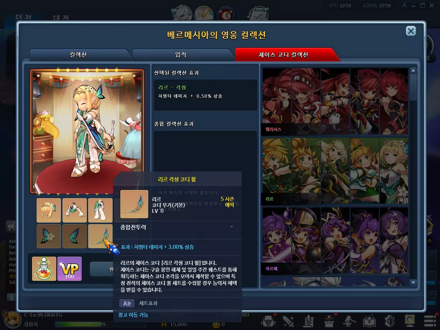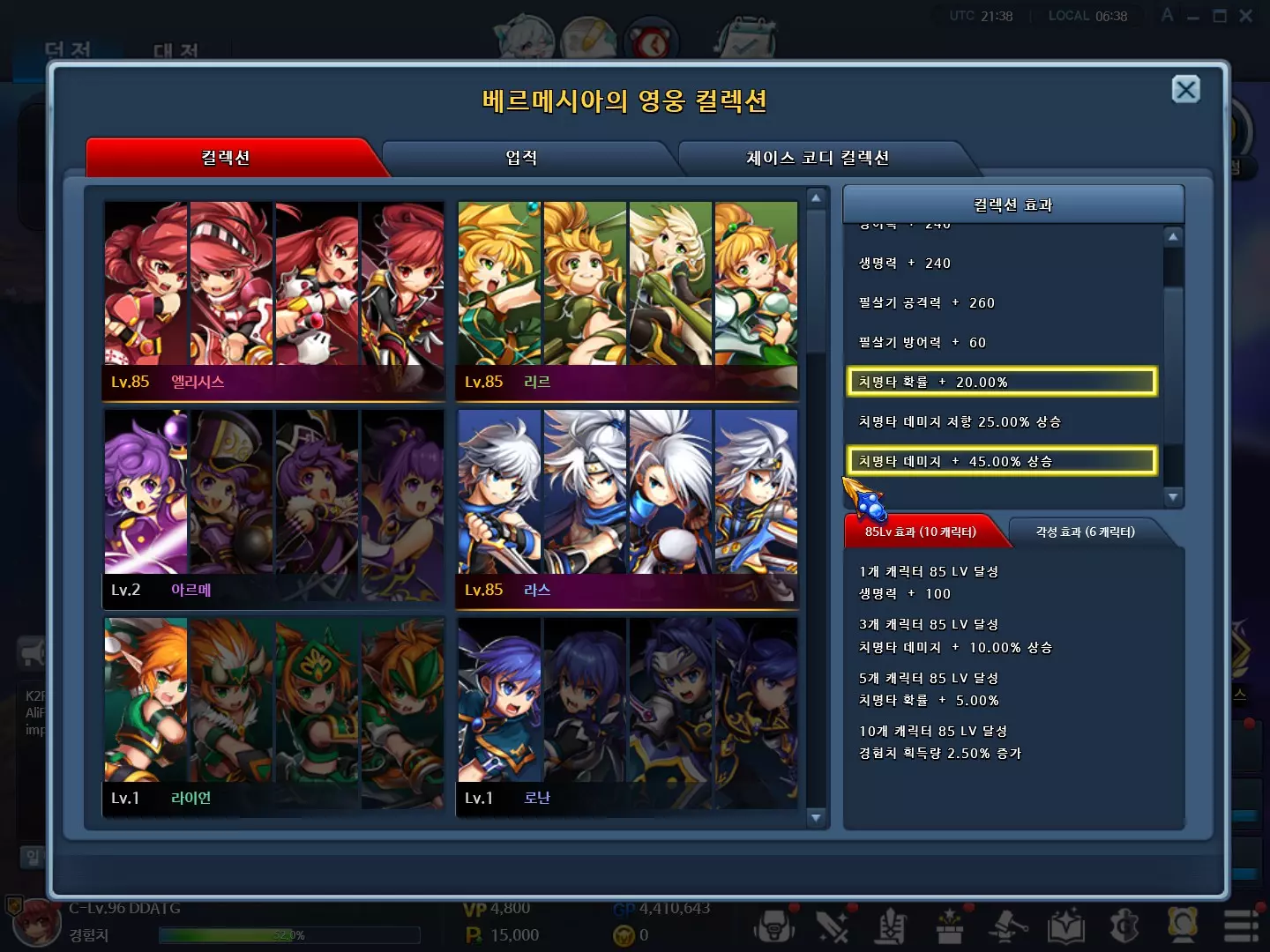 通常开始着手英雄收集的时候,是主力角色的属性提升变得紧急之时。因此,提升直观显示的综合战斗力是当务之急。 以下角色都需要完成最终转职,如果有喜欢的角色,建议进行觉醒。 1순위:暴击概率 里尔、拉斯、真、鲁珀斯、艾德尔、迪卡内 达到85级(5个角色) 觉醒(5个角色) 2순위:暴击伤害 吉克哈特、迪奥、雷、艾伊85级达成(3个角色) 觉醒(3个角色) 3优先级:攻击力及必杀技攻击力 阿尔梅、艾丽希斯、罗南、玛丽、阿辛、琳、卡莉娅、优诺 4优先级:背击伤害 实际上从DPS提升角度来说属于2~3优先级,但由于对外显示的综合战斗力提升不大,所以被归为4优先级。从这之后,大家就自行培养吧。 2-2. 提升属性 - 追逐点数 完成卡牌收集,或角色达到85级并完成所有成长任务,都可以增加追逐点数。从长远来看,投资于经验值获取量,然后拥有能够通关【欢迎的迷宫】30层的多个角色,是提升【追击等级】最快的捷径。当然,在【审判之地】刷怪时,也要始终装备【成长的戒指】。 如果打算长期玩游戏,并且每天或每周完成任务,那么追击点数应优先投入经验值。 如果不是这种情况,建议按以下顺序进行投资: ① 技能MP消耗减少 虽然因角色而异,但如果MP补给困难,这绝对是第一优先级。不过,如果MP补给容易,就没必要特意投资了。参考而言,在卡牌槽上,比起装备MP恢复量,更建议装备暴击概率、暴击伤害、必杀技攻击力等属性。这样即使综合战斗力略有下降,但如果集中投资于伤害,这笔投资的价值会更高。 另一方面,对于真来说,由于破天荒的4段技能是主要输出手段,优先投资于冷却时间减少也是不错的选择。 ② 首领伤害/攻击及打击伤害/技能伤害 攻击及打击伤害建议在像里尔(石弓)这类普攻占伤害份额相当大的角色身上优先投资。不过攻击伤害也会提升,所以如果对操作没信心的话,优先投资首领伤害即可。③ 冷却时间减少/攻击力/初始MP/侵蚀抵抗力 根据目标不同而有所差异。若想提升综合战斗力,可选择攻击力;若希望战斗循环更顺畅,可选择冷却时间减少;若想降低重复内容的疲劳度,可选择初始MP;若想探索哈里亚地区,可选择侵蚀抵抗力进行投入。 ④ 之后建议自由进行投入。 2-3. 提升属性 - 卡牌收集 卡牌收集系统中,每张卡牌最高可升至3级,卡牌收集等级的总和决定了收藏等级。每提升50级收藏等级,可额外获得1点追猎点数。虽然比不上英雄收藏,但可以小幅提升暴击概率、暴击伤害、攻击力、必杀技攻击力、MP恢复量等有效属性,因此对突破后续内容的属性限制有很大帮助。 由于通过合成可获得的卡牌数量众多,提升收藏等级存在一定限制。不过,如果坚持参与提供卡牌的内容(英雄硬币、贝卡斯、深渊之路、虚空、审判之地等),收藏等级达到1000 - 1200左右应该不成问题。这是将所有卡牌列表数据化后单独计算得出的结果。 那么攻击力 + 必杀技攻击力总和2200,暴击概率2.12%,MP恢复量4。可以获得24%、致命一击伤害12.73%的惊人属性。 2-4. 属性提升 - 追击搭配